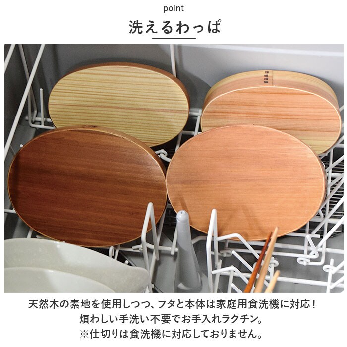 | 商品説明 | 忙しい毎日の味方!日本製&食洗機対応の曲げわっぱ弁当箱(Sサイズ)が登場。【洗えるわっぱ】天然木の素地を使用しつつ、フタと本体は家庭用食洗機に対応!煩わしい手洗い不要でお手入れラクチン。(※仕切りは食洗機に対応しておりません。)【毎日使いに最適】ナチュラルにはウレタン塗装、ブラウン/摺りには漆塗装済みで、汚れや傷付きを防止。【特殊なプリベントコート加工】さらにプリベントコート加工を施し、耐熱性や防汚性、耐摩擦性(傷付きを防止するハードコート)、安全性(日本加工)にも優れたアイテム。【調湿性も兼ね備えた優れもの】木の呼吸を妨げない塗装なので、わっぱ弁当箱ならではの調湿性も!ご飯がベチャつきにくく、美味しく食べられるのが嬉しい♪【T字仕切り付き】おかずが片寄りにくい仕切り付き。盛り付けもラクラク。【ぬくもりのある弁当箱】美しい木目と優しい風合いが魅力◎高級感のある仕上がりで、おかずの見栄えもアップ。【ゴムバンドが付属】お弁当箱をしっかりホールドできて、持ち運び時も安心。【コンパクトな400mlサイズ】少食の方や小学生のお子さまにぴったりなサイズ感。【新生活のお供に】これから始まる新生活、新学期に合わせてお弁当箱を新調♪ギフトにもおすすめ。 |