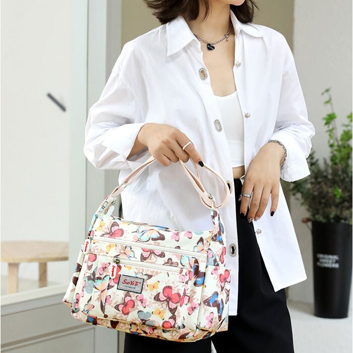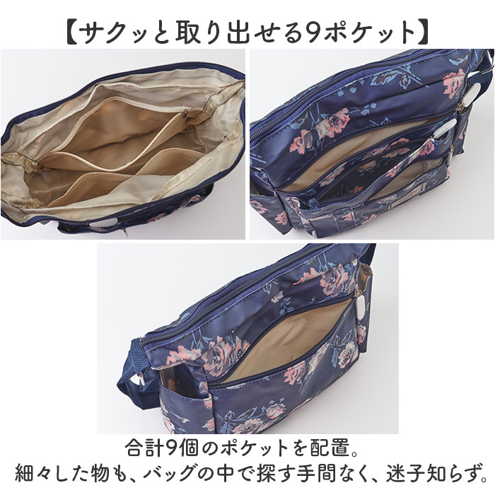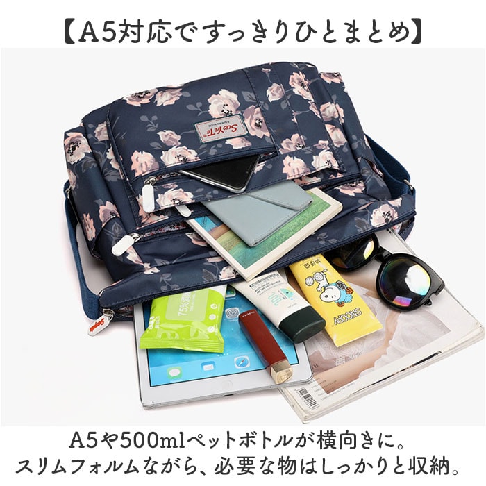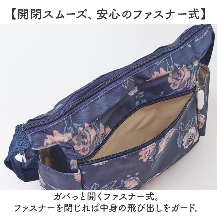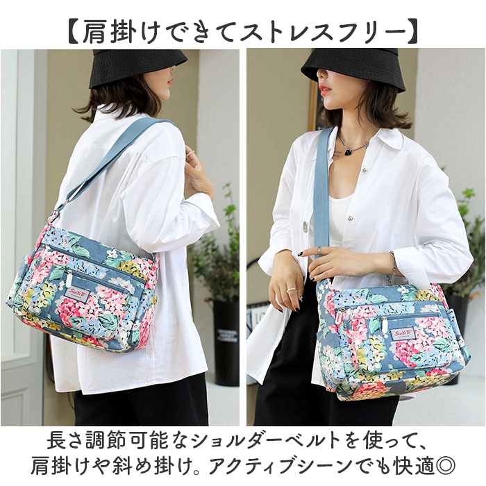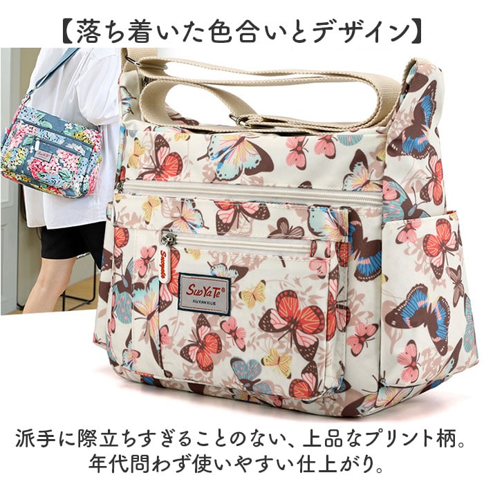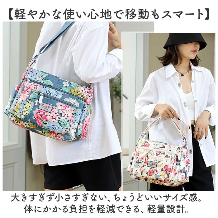 | 商品説明 | 【使い勝手が良くアクセントにも】全面プリント柄が印象的♪サッと持ち出せて、色んなシーンで大活躍の「ショルダーバッグ」。【軽やかな使い心地で移動もスマート】大きすぎず小さすぎない、ちょうどいいサイズ感。体にかかる負担を軽減できる、軽量設計。【落ち着いた色合いとデザイン】派手に際立ちすぎることのない、上品なプリント柄。年代問わず使いやすい仕上がり。【肩掛けできてストレスフリー】長さ調節可能なショルダーベルトを使って、肩掛けや斜め掛け。アクティブシーンでも快適◎【開閉スムーズ、安心のファスナー式】ガバっと開くファスナー式。ファスナーを閉じれば中身の飛び出しをガード。【A5対応ですっきりひとまとめ】A5や500mlペットボトルが横向きに。スリムフォルムながら、必要な物はしっかりと収納。【サクッと取り出せる9ポケット】合計9個のポケットを配置。細々した物も、バッグの中で探す手間なく、迷子知らず。【ちょっとの雨なら大丈夫】表面は汚れや水滴を弾きやすい、撥水加工済み。お手入れも拭き取るだけ。(※)完全防水ではありません。【お気に入りを選んで相棒に♪】花柄や蝶々などのデザインをラインナップ。ロゴタグやファスナー引き手もポイント。【ポケット仕様】内側:ファスナーポケット×1、オープンポケット×2前面:ファスナーポケット×3サイド:オープンポケット×2背面:ファスナーポケット×1 |