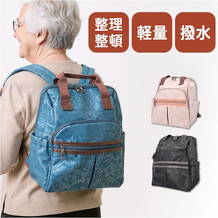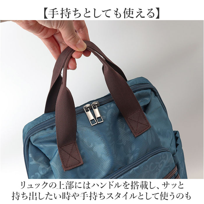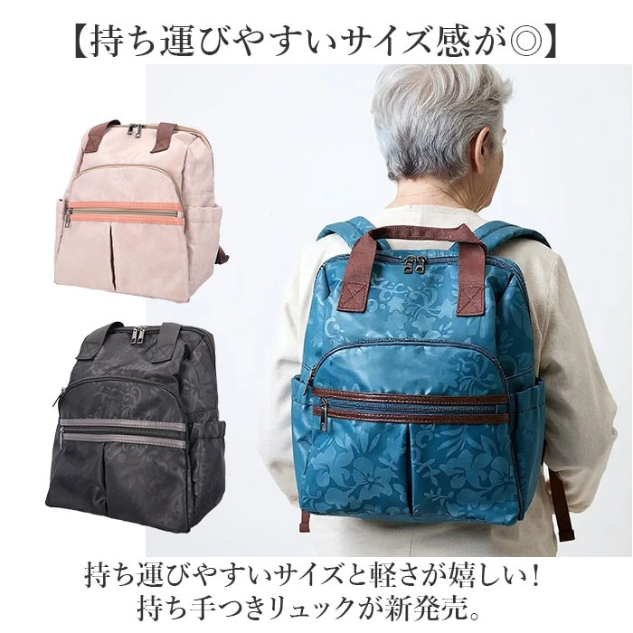 | 商品説明 | 【持ち運びやすいサイズ感が◎】持ち運びやすいサイズと軽さが嬉しい!持ち手つきリュックが新発売。【通院やお出かけに】お財布やハンカチタオル、ポーチがまとめて収納可能なサイズ感◎【小物が多くなっても安心】マチ幅をしっかり設け、小物類が多い時でも見た目以上に入るのも嬉しいポイント。【整理整頓して収納可能】整理整頓しながら収納できる計7ポケット仕様なのもGOOD。【手持ちとしても使える】リュックの上部にはハンドルを搭載し、サッと持ち出したい時や手持ちスタイルとして使うのも【突然の雨でも安心】表地は撥水加工を施しちょっとの雨を弾く◎汚れが付きにくいのも魅力的。※(※)完全防水ではございません。【ふわっと軽い背負い心地】軽量素材で作られており、ふわっと軽い背負い心地で長時間背負っていても負担にならない♪【シックな見た目で大人の女性に】ワンカラーにボタニカルのエンボス加工を施したシックな見た目で大人の女性にピッタリ☆【ポケット仕様】メインルーム・・・オープンポケット×1、ファスナーポケット×1フロント・・・ファスナーポケット×2背面・・・ファスナーポケット×1両サイド・・・オープンポケット×1ずつ |