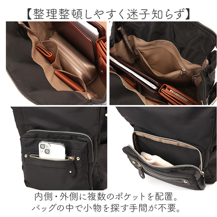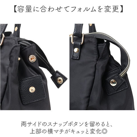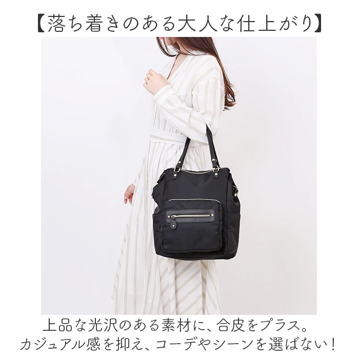 | 商品説明 | 【頼りになるお出かけの相棒☆】シンプルなデザインに嬉しい機能性◎ヘビロテ間違いなしの「3WAYリュック」が新登場。【落ち着きのある大人な仕上がり】上品な光沢のある素材に、合皮をプラス。カジュアル感を抑え、コーデやシーンを選ばない!【サッと持ち出せて使い勝手抜群】お出かけに必要な小物がすっきり。手に取りやすく、デイリーに活躍!【お好みに合わせてスタイルチェンジ】リュックとしてはもちろん!ベルトを背面ポケットに収納し、肩掛けや手提げにもなる3WAY☆【ガバっと開くダブルファスナー】左右どちらからもオープン!出し入れしやすく、ファスナーを閉じれば、プライバシーも確保◎(※)ファスナー部は両サイドのスナップボタンで留めることが可能です。【A4対応!荷物がひとまとめ】A4サイズがぴったりIN。程よいマチでレジャーや旅行用、マザーズバッグとしても重宝。【容量に合わせてフォルムを変更】両サイドのスナップボタンを留めると、上部の横マチがキュッと変化◎【整理整頓しやすく迷子知らず】内側・外側に複数のポケットを配置。バッグの中で小物を探す手間が不要。【流行に左右されず長く愛用】無駄を省いたスタイリッシュデザイン。年代問わず持ちやすいカラーをラインナップ。【ポケット仕様】内側:ファスナーポケット×1、オープンポケット×2前面:ファスナーポケット×2サイド:オープンポケット×2背面:スナップボタン式ポケット×1(ショルダー収納用) |