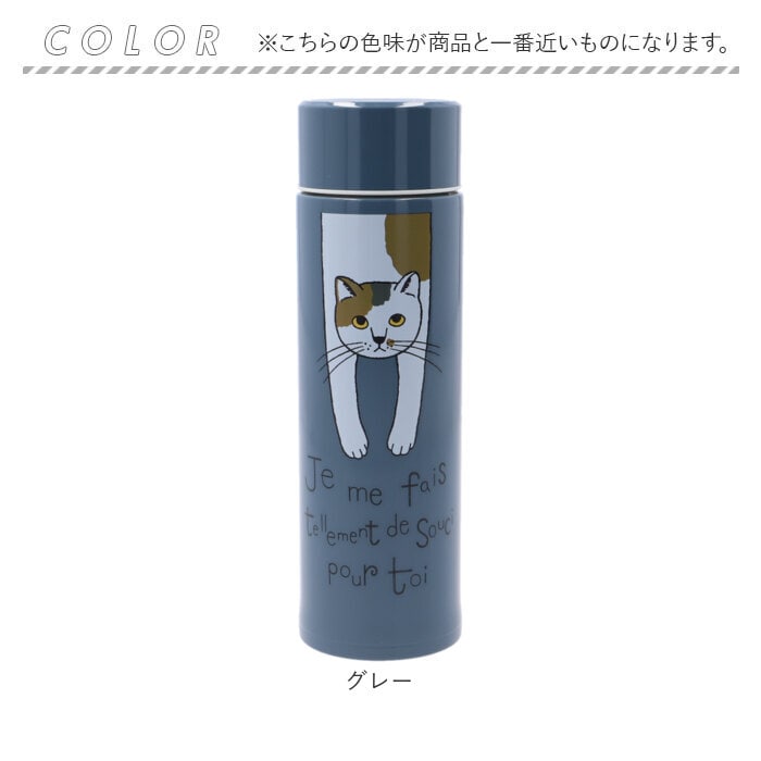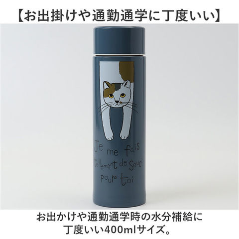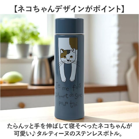 商品説明【ネコちゃんデザインがポイント】たらんッと手を伸ばして寝そべったネコちゃんが可愛い♪タルティーヌのステンレスボトル。【タルティーヌオリジナル】人気作家の戸崎尚美さんが描いたネコのシャロンをフィーチャーしたシリーズ「タルティーヌ」【真空二重構造で美味しさキープ】飲み頃温度を保って美味しく楽しめるステンレス真空二重構造なので、夏から冬まで一年中大活躍!【開け閉めスムーズ】手のひらに優しくフィットするつるんと滑らかなキャップデザインで、軽い力で開け閉めスムーズ。【液漏れもしっかり防止!】キャップ内側に付いたシリコーンパッキンで、持ち運び中の液漏れをしっかり防止!【滑らかな飲み口パーツ】フチを滑らかに加工し、口当たりの優しい飲み口パーツを採用。【氷が飛び出ない】中にいれた傾けても氷が飛び出ない飲み口の形状でゴクゴク飲みやすい◎【取り外し簡単でお手入れ楽々】パッキンなどパーツは取り外しがしやすく、細かいところまで洗浄でき衛生的に保てる◎【軽量&スリム設計】いつもの通勤・通学用バッグにかさばらずに収納できる、スマートなフォルム。【お出掛けや通勤通学に丁度いい】お出かけや通勤通学時の水分補給に丁度いい400mlサイズ。【センスが際立つ大人カラー】澄まし顔のネコちゃんの表情と落ち着いた大人シックなカラーにもセンスがキラリ☆