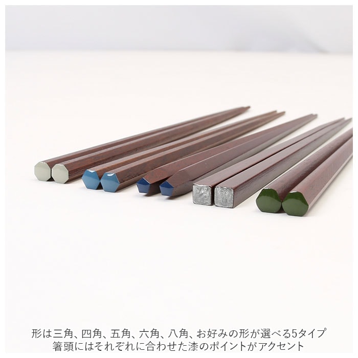 | 商品説明 | 自分の手にしっくり馴染むお箸で毎日を快適に。「かたちプロジェクト 多角形箸。」天然木に漆塗り加工がされているので、使い心地が良くお手入れも簡単。細めの箸先で食材がつかみやすく、使い勝手抜群。長さは男性の手にぴったりな23cm、女性の手に馴染む21cmの2タイプ。形は三角、四角、五角、六角、八角、お好みの形が選べる5タイプ。箸頭にはそれぞれに合わせた漆のポイントがアクセント。シンプルなデザインで普段使いに最適。安心の日本製。 |