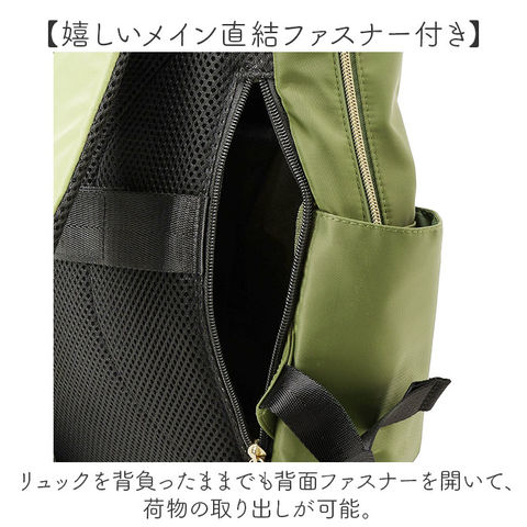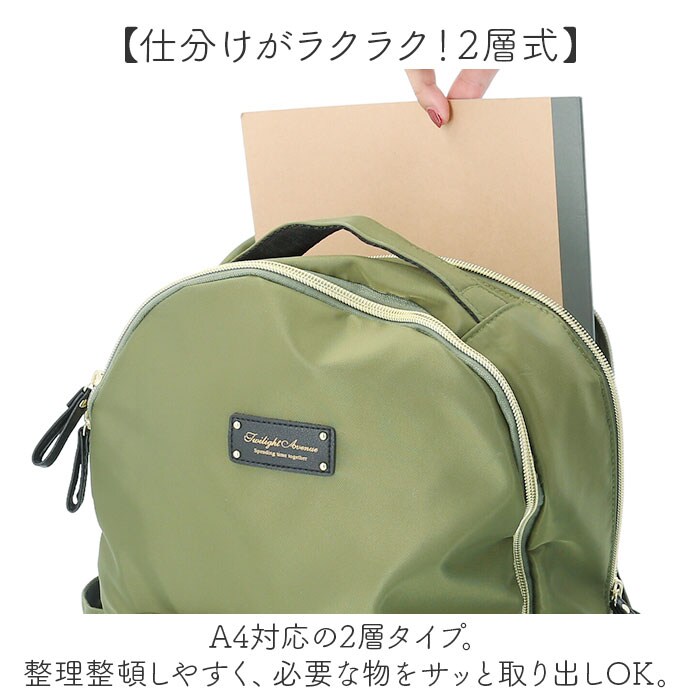 | 商品説明 | 【お出かけの相棒にぴったり】色んなシーンでヘビロテ間違いなし☆多機能な「TWILIGHT AVENUE リュック」。【軽やかで使い勝手抜群なリュック】必要なものはしっかり収納できて、サッと持ち出せる!お出かけや旅行、マザーズバッグにも♪【仕分けがラクラク!2層式】A4対応の2層タイプ。整理整頓しやすく、必要な物をサッと取り出しOK。【ガバっと開くダブルファスナー】左右どちらからもオープン!出し入れしやすく、ファスナーを閉じれば、プライバシーも確保◎【たっぷり収納できるメインルーム】程よくマチを設け、複数のポケット付き。着替えやボトル類、タブレットもIN。【嬉しいメイン直結ファスナー付き】リュックを背負ったままでも背面ファスナーを開いて、荷物の取り出しが可能。【スリムな物をINできるポケット】もう1層のポケット(サブ)は、ファイルに入れた書類やノートなどの収納におすすめ。【迷子知らず◎充実の14ポケット】合計14個のポケットとキーフックを装備。小物を探す手間を省けて、スマートな収納が叶う♪(※1)2層の1つであるダブルファスナーポケットを含めて、14ポケットとなります。【ポケット位置をひと目で把握】メインとフロントポケット内は、カラーテープでポケット位置がわかりやすいつくり。【負担をかけず背負い心地快適】背面とショルダーベルトには、クッション性をプラス。どちらもムレにくいメッシュ仕様。【キャリーオンOKで移動もスマート】背面の面ファスナーテープをキャリーケースのバーに通すことができる、キャリーオンタイプ。(※2)面ファスナーでフィット感を調節できます。【お気に入りを選べるカラー&質感】異なる素材とカラーをラインナップ。全てコーデやシーンを選ばず使えるシンプルデザイン。 |