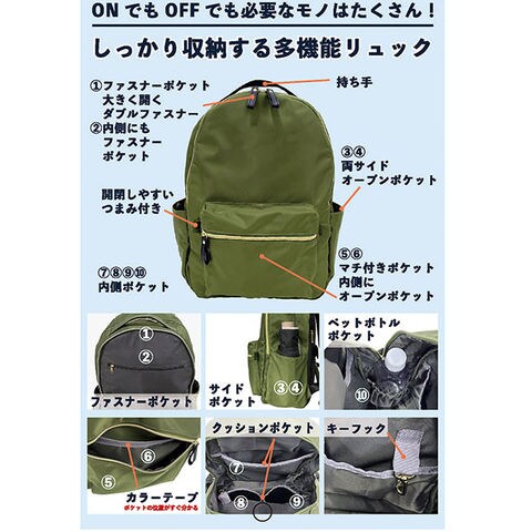 | 注意点 | 【ポケット仕様】メインルーム内側:オープンポケット×3(内側メッシュ仕様)、ボトルポケット×1サブ:ダブルファスナーポケット×1(内側にファスナーポケット×1)前面:ファスナーポケット×1(内側にオープンポケット×1。外側両サイドに開閉しやすいつまみ付き)サイド:オープンポケット×2背面:シークレットポケット×1上部:ファスナーポケット×1ショルダー:ファスナーポケット×2年月の経過や空気中の湿度や紫外線、熱や汚れ等により、劣化などが生じる場合があります。長時間日光にあたったり、摩擦、水漏れなどによる色落ちや色移りすることがあります。お取り扱いの際は、商品やパッケージなどに記載されている品質表示、アテンションタグ、ご使用上の注意事項などを必ずご確認下さい。本来の目的以外にはご使用にならないで下さい。カメラやモニターの性質により、画像と実物の色の違いがある場合がございますのでご理解願います。 |