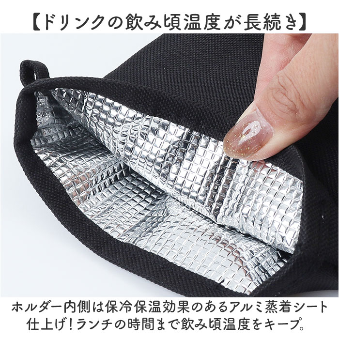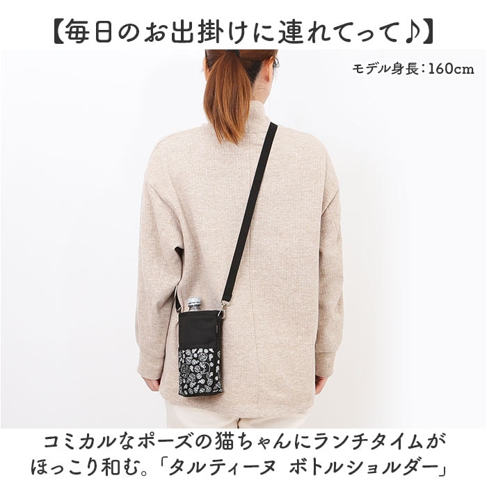 | 商品説明 | 【毎日のお出掛けに連れてって♪】コミカルなポーズの猫ちゃんにランチタイムがほっこり和む。「タルティーヌ ボトルショルダー」【Tartine オリジナルデザイン】「タルティーヌ」は人気作家の戸崎尚美さんが描いた猫のシャロンをフィーチャーした雑貨シリーズ。【ドリンクの飲み頃温度が長続き】ホルダー内側は保冷保温効果のあるアルミ蒸着シート仕上げ!ランチの時間まで飲み頃温度をキープ。【サッとひと拭きで簡単キレイ】内側のアルミ蒸着シートははっ水性も抜群!飲みこぼしや結露がサッと拭き取れてお手入れが簡単。【ステンレスボトルもIN!】500mlペットボトルサイズにピタッと対応!ステンレスボトルやクリアボトルもすっぽり収納可能。※ボトルのデザインによっては収納できない場合がございます。事前にサイズをご確認ください。【小物も一緒に持ち歩き】バッグ外側に、ウェットティッシュやちょっとした小物がしまえて便利なオープンポケットも装備。【両手が空いて、ストレスフリー】ショルダーベルトで身軽な肩掛けスタイル♪両手が空いて動きやすく、通勤通学やアウトドアに最適。【長く使えて、ぴったりフィット】ショルダーベルトは最長124cmまで伸長。お子さまから大人まで幅広い世代の方にフィット。【バッグインする時にも便利】ショルダーを外せば、場所を取らずにバッグインもOK!バッグの中が結露で濡れないのが嬉しい。【お出掛けスタイルに馴染むカラー】落ち着いた生地色にジッとこちらを見つめる猫ちゃんを描きだした、癒し感たっぷりのシンプルカラー。 |