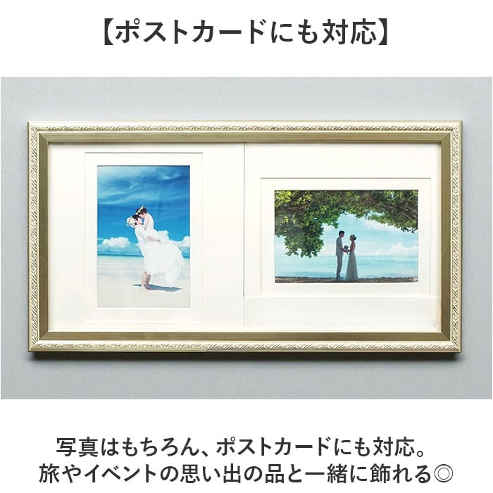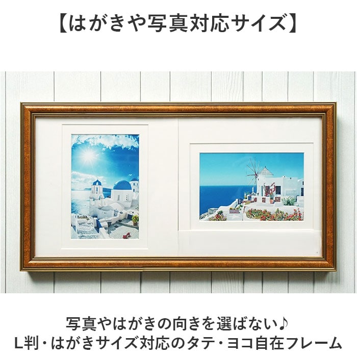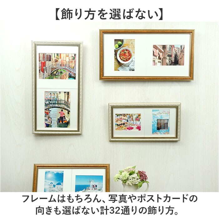 | 商品説明 | 【はがきや写真対応サイズ】写真やはがきの向きを選ばない♪L判・はがきサイズ対応のタテ・ヨコ自在フレーム【ポストカードにも対応】写真はもちろん、ポストカードにも対応。旅やイベントの思い出の品と一緒に飾れる◎【飾り方を選ばない】フレームはもちろん、写真やポストカードの向きも選ばない計32通りの飾り方。【オシャレなインテリアに】フレームはアンティーク風のデザインで、思い出がオシャレなインテリアにチェンジ♪【安心の窓枠】窓枠は飾りながら汚れやほこりなどからカバーできる透明板付き。【卓上に飾れる】背面にはスタンドが付いているので、テーブルやラックなど卓上にも置くことが可能。【壁掛けもOK】さらにフレームの背面に壁掛け用の吊り金具も搭載し、壁掛けも可能。 |