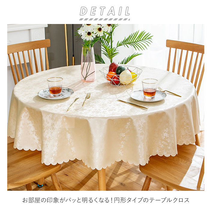 | 商品説明 | お部屋の印象がパッと明るくなる!円形タイプのテーブルクロス。いつものテーブルにかけるだけで、テーブルをキズや汚れから守ってくれる◎撥水性のある生地を採用しているから、食べ物をこぼしても生地に染み込まない!調味料をこぼしても、サッと拭くだけでOK。お手入れが楽ちんなのが嬉しい。デザイン違いで揃えれば、季節や気分によってカンタンに模様替えできる♪ |