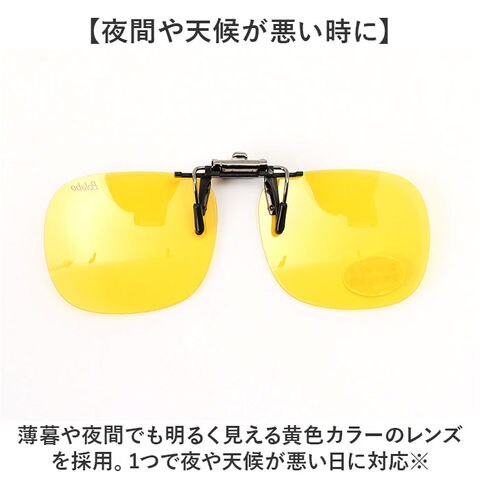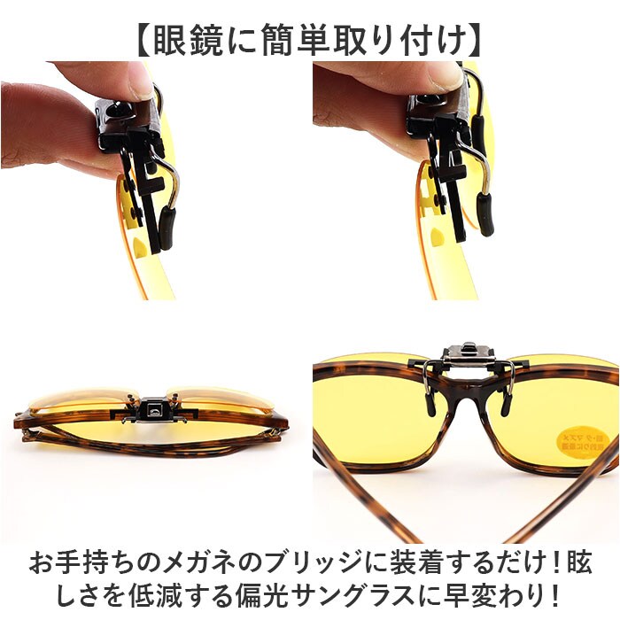 | 商品説明 | 【夜間も見やすい偏光レンズ】超視界偏光サングラス「冒険王」から夜間も見えやすいナイトホーク クリップが新発売。【夜間や天候が悪い時に】薄暮や夜間でも明るく見える黄色カラーのレンズを採用。1つで夜や天候が悪い日に対応※【眼鏡に簡単取り付け】お手持ちのメガネのブリッジに装着するだけ!眩しさを低減する偏光サングラスに早変わり!【紫外線をしっかりカット】紫外線もしっかりカットするレンズで目に優しく紫外線が多い時間帯でも活躍。【反射光をカットしクリアな視界】水面のギラつきやガラスの映り込みなど反射光による視界の遮りを抑え、クリアな視界を提供。【様々なシーンで活躍】長時間付けていても疲れにくい軽量さ。釣りやドライブにもオススメ♪【持ち歩きに便利な収納袋付き】お気に入りの「冒険王」をいつでも気軽に持ち歩ける!携帯に便利な巾着タイプの収納袋が付属【注意事項】※ コンテラストを高め視界を明るく鮮明に見せる効果があり、くもりや雨の日などの使用に適したレンズカラーです。そのため、他のカラーと比べると偏光機能が弱くなり日差しのカットや眩しさ防止には効果が弱いレンズカラーとなります。予めご了承ください。 |