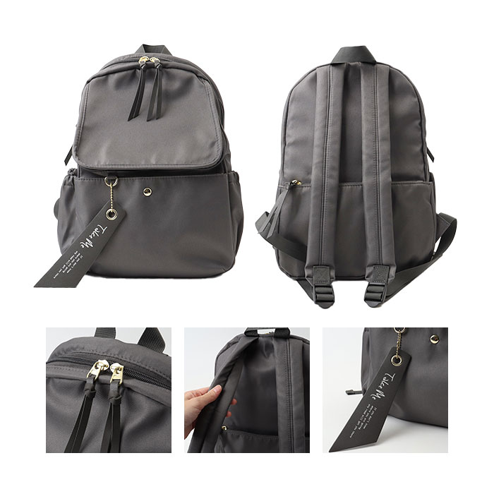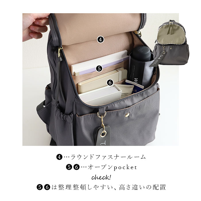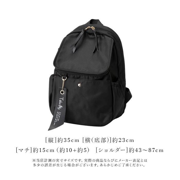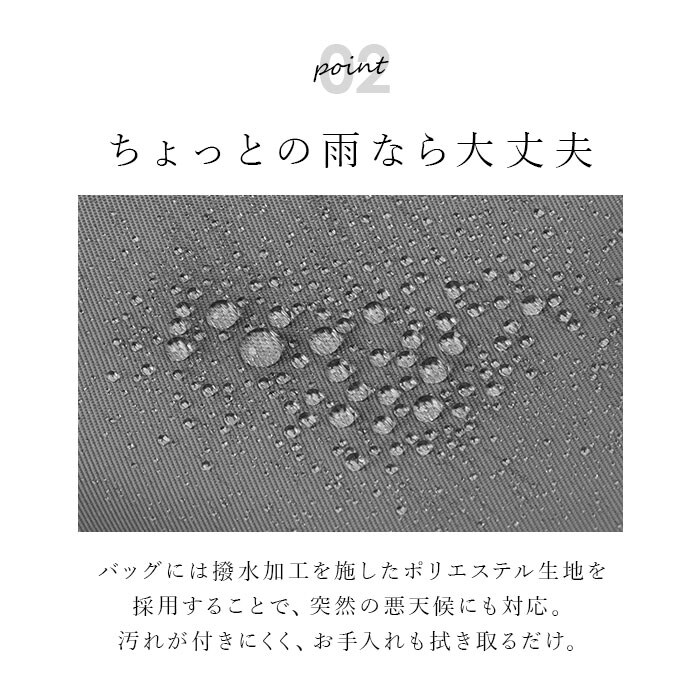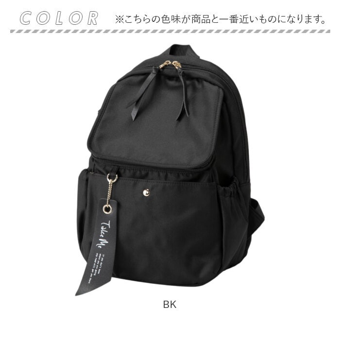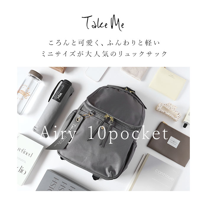 | 商品説明 | 【どこへでも連れて行きたくなる相棒】コンパクトで軽く、空気みたいな存在♪「TakeMe Airy 10pocket」。【小さくても頼りになるアイテム】コンパクトなサイズ感ながら機能的☆多くのポケット付きで、休日もビジネスもお任せ!【軽やかな背負い心地でノンストレス】重さ500gほどの軽量設計。クッション材入りのショルダーが優しくフィットし、疲れを軽減。(※1)当店計測重量は約462gで、個体差がございます。【ガバッと開くメインルーム】ダブルファスナーで、左右どちらからもオープン。間口が広く、出し入れ簡単。【マストアイテムをひとまとめ】程よいマチを設け、ポーチなどもすっぽり。必要な物がざっくりひとまとめ。【タブレットなどもOK、サブルーム】後面にはダブルファスナー式のサブルーム。タブレットなどを入れておけて便利。(※2)背面にクッション材入りです。【充実のポケット付きで収納上手】合計10個のポケットを配置。細々した物も、バッグの中で探す手間が不要。(※3)メインルーム・サブルーム合わせて10ポケット仕様です。【保冷機能付きの便利なポケット】片側のサイドポケット内側は、保冷シート仕様。ペットボトルなどをIN。【貴重品も安全に持ち歩ける】背面のシークレットポケットは、絶妙な深さと大きさ。スマホやお財布を入れやすい◎【ちょっとの雨なら大丈夫】汚れや水滴を弾きやすい撥水加工生地を採用。汚れが付きにくく、お手入れも拭き取るだけ。(※4)完全防水ではありません。【スタイリッシュなデザイン】コーデに馴染むカラーに、素材を変えた引き手やタグがアクセント!フロントにDカン付き。【ポケット仕様】メインルーム内側:オープンポケット×2サブルーム内側:面ファスナー式ベルトポケット×1、ファスナーポケット×1前面:マグネットポケット×1サイド:ギャザーポケット×2背面:シークレットポケット×1 |