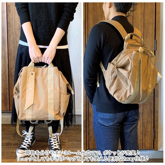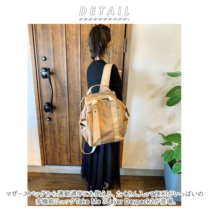 | 商品説明 | マザーズバッグから通勤通学にも使える、たくさん入って便利がいっぱいの多機能リュックTake Me 3Layer Daypack2が登場。荷物を分けやすい3ルーム仕立てで、ポケットが充実♪リュックとしても手さげバッグとしても使える便利な2way仕様♪メインルームは左右から開けやすいダブルファスナーで、ガバッと開く!中身が見やすいから、たっぷりの荷物も出し入れスムーズ。A4サイズの雑誌もらくらく収納。内部には大小オープンポケットと鍵などの無くしやすい小物を収納出来るジッパーポケット付き。メインルームの前後には、B5サイズが入る深めのポケットとお財布やポーチ入れに最適な浅めのポケットを配置。左サイドにはアルミシート付きポケットを装備し、濡れた傘や冷たいペットボトルの収納に最適。右サイドのオープンポケットには水筒などを入れるのに◎背面サイドの縦型大ポケットはメインルームに直結していて、背負ったまま荷物が取り出せて楽ちん。横型の小ポケットは独立した収納で、スマホなどの貴重品を入れても安心。他にも、暗闇で目立つリフレクタータグ、雨でも安心な撥水加工、ベビーカーなどのフックに掛けられるDカン付き、肩パッドには負担軽減のクッション入りと便利機能がたくさん!女性だけでなく男性でも使えるユニセックスなカラーバリエでママとパパで兼用も出来るのも嬉しい♪ショルダーベルトはバックル付きなのでおんぶ紐を外すことなく、赤ちゃんを抱っこしたままリュックを下ろせるのが嬉しい♪左サイドにはアルミシート付きポケットを装備し、濡れた傘や冷たいペットボトルの収納に最適。右サイドのオープンポケットには水筒などを入れるのに◎背面サイドの縦型大ポケットはメインルームに直結していて、背負ったまま荷物が取り出せて楽ちん。横型の小ポケットは独立した収納で、スマホなどの貴重品を入れても安心。他にも、暗闇で目立つリフレクタータグ、雨でも安心な撥水加工、ベビーカーなどのフックに掛けられるDカン付き、肩パッドには負担軽減のクッション入りと便利機能がたくさん! |