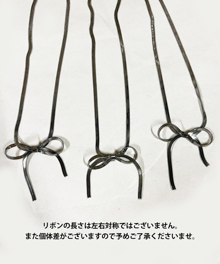 | 注意点 | 当商品は海外生産の製品となり、軽微な傷、汚れがある場合がございます。照明やモニターの写り具合により、画像と実際の商品の色が多少違って見える場合がございます。リボンの形に個体差がございます。生産時期により、パーツの仕様や細部のデザイン、素材感に若干の個体差が生じる場合がございます。汗などやその他水分や摩擦や経年劣化等により変色/色落ち/色移り/錆つく場合がございます。充分にご注意の上着用して頂けますようお願いいたします。ご使用の過程で、繋ぎ目のパーツが外れる場合がございます。その際は、大変恐れ入りますが、ペンチなどを用いてお客様ご自身で優しくお直しいただけますと幸いです。あらかじめご理解のほどお願いいたします。以上、予めご了承の上ご注文して頂けますようお願いいたします。 |