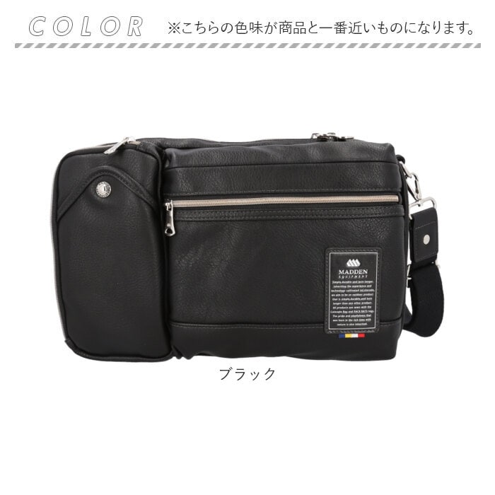 商品説明便利な3WAY☆毎日使いたくなる高クオリティ。大人も満足のアイテム「MADDEN EQUIPMENT 3wayボディバッグ」が登場。【MADDEN EQUIPMENT】バッグメーカーとして10年以上数多くの製品を販売してきた「Bianchi」が、日本国内のライセンス事業終了から受け継いだ新ブランド。ブランドコンセプトは、より使いやすく、より良い価格で、長く愛用できるアイテムを。【ベルトアレンジで3WAY】付属のベルトは取り外し可能なので、セカンドバッグ、ショルダーバッグ、ボディバッグの3WAYにアレンジ可能。シーンに合わせてチェンジ☆【たっぷり大容量】お出かけに必要な物が全部、たっぷり入る容量6L。タブレットやペットボトル、折り畳み傘などの収納もOKの安心サイズ。メインにはクッションポケットを搭載!【上品なPUレザー】ベーシックなデザインに、ブランドネームとPUレザーの組み合わせで、上品さのあるボディバッグに!カジュアルになりがちなボディバッグを大人っぽく仕上げたアイテム。【撥水性】水をはじきやすい、撥水加工を施したアイテム。突然の雨でも安心。汚れに強いのでお手入れも簡単。【荷物の出し入れがスムーズ】メイン収納はガバっと開くダブルファスナー仕様。中が見えるので必要な物を取り出しやすい!外側にはポケットを3箇所配置し、メインを開けずにスムーズに小物を取り出し◎【背負いやすい】クッション性あるメッシュ素材を使用した背面で、ムレにくく快適な背負い心地。オールシーズン使える仕様。【こだわりの内生地】バッグを開けた時におしゃれさを発揮する、こだわりの内生地。ブランド創業の地、コロラド州にあるエメラルド湖をイメージした、鮮やかなカラー。【ポケット仕様】フロント部分:マグネットボタンポケット×1、ファスナーポッケット×2メイン収納:クッションオープンポケット×1