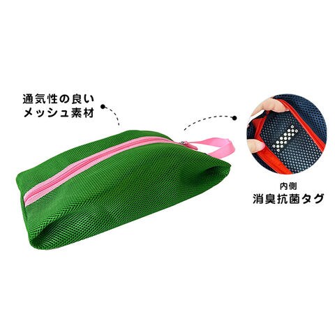 | 商品説明 | 通気性の優れたメッシュ素材のシューズケース。子供から大人までのシューズを収納できます。消臭抗菌機能のデオドラントネーム(R)付。 |