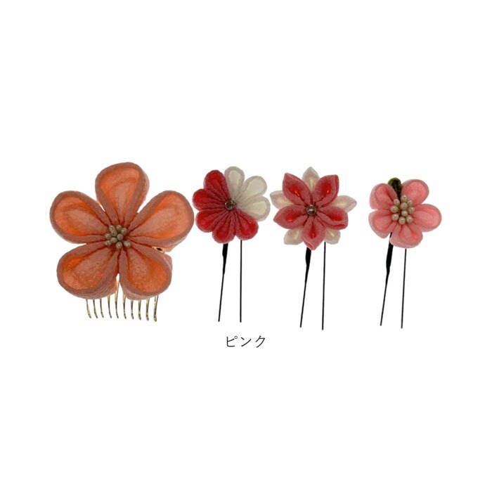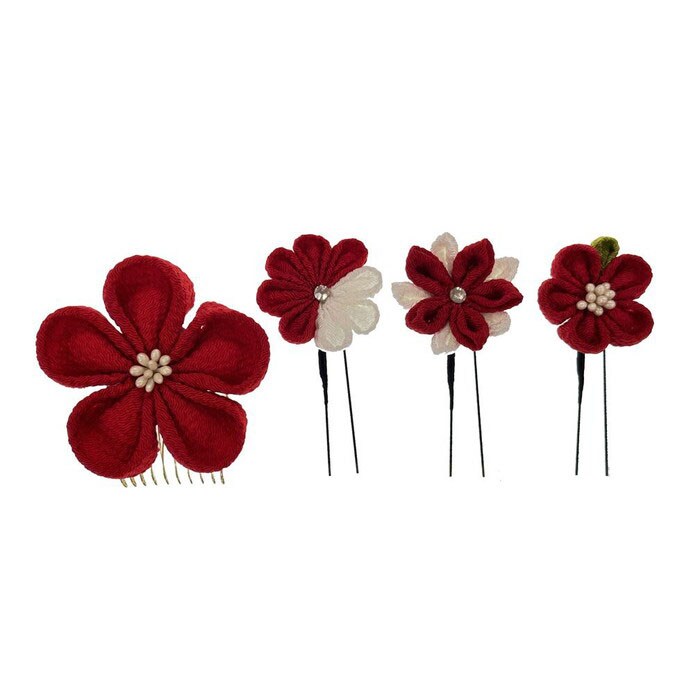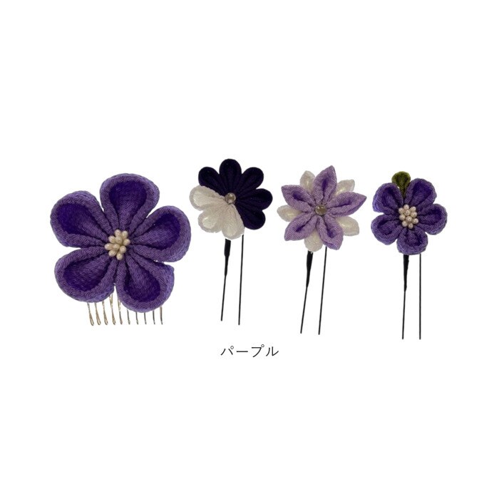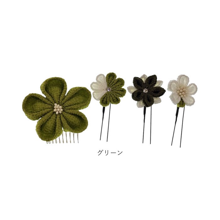 | 商品説明 | 上品な光沢感のある生地を使用し、落ち着いた色合いでまとめた大人可愛いつまみ細工の髪飾りセット。大花1点(コーム仕様)と、小花3点(Uピン仕様)の4点セットで、まとめ髪に華やぎとやさしさを添える。 |