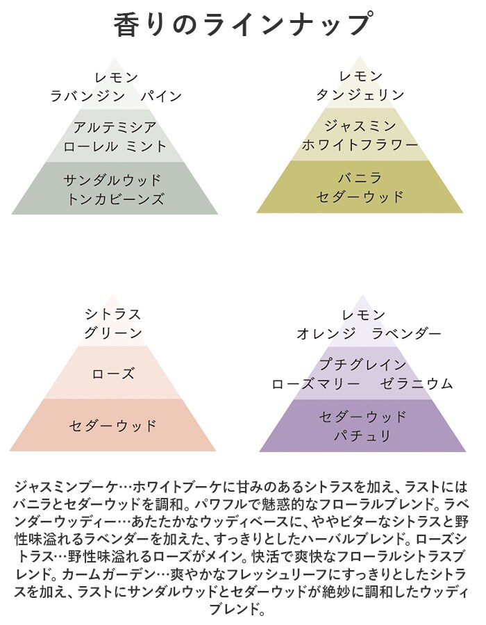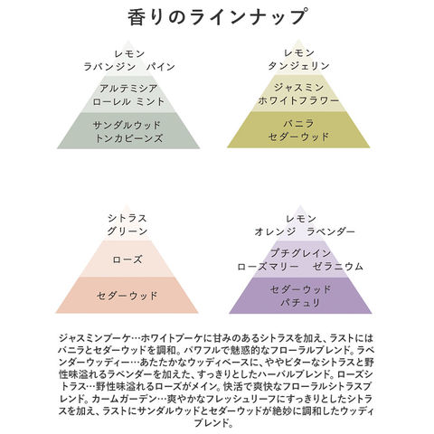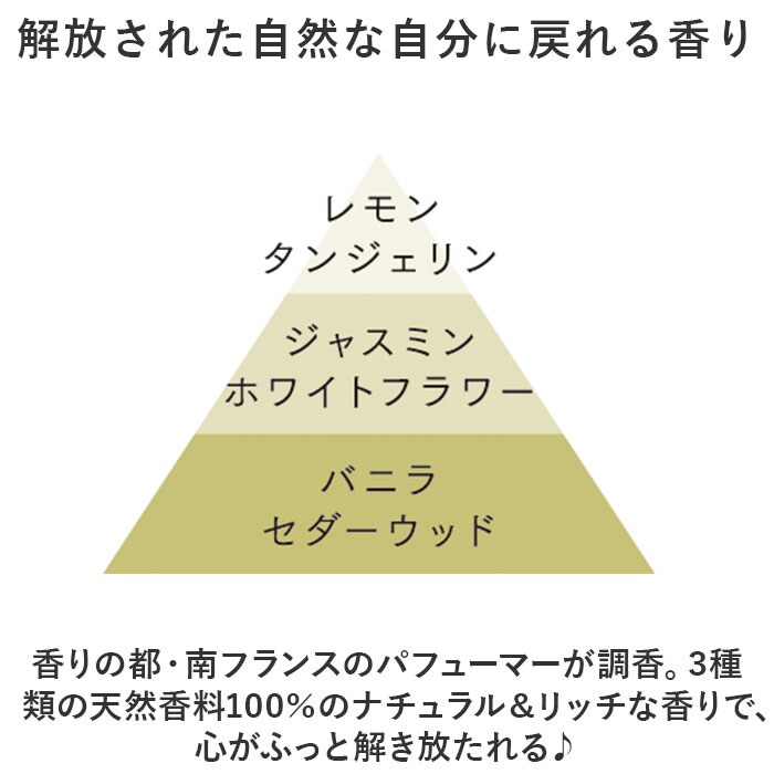 | 商品説明 | 天然香料100%!やすらぎのひとときに、そっと寄り添うように香る♪シンプルでおしゃれな「TOLEWA リードディフューザー」が新登場。【香りで心もリラックス】お部屋全体を心地よい香りで包み込む♪暮らしが豊かになるアイテム。【解放された自然な自分に戻れる香り】香りの都・南フランスのパフューマーが調香。3種類の天然香料100%のナチュラル&リッチな香りで、心がふっと解き放たれる♪【あらゆる空間に馴染む吹きガラス】透明感のあるユニセックスデザイン。継ぎ目のない吹きガラスは、インテリアの邪魔をせず素敵にマッチ。【手軽にセット!火を使わず安全】容器に香料液を注ぎ、ラタンスティックを挿すだけ。スティックの本数を変えることで、香りの強さを調節可能。【毎日の生活にお気に入りの香りを】お部屋や玄関先などに香りをプラスすることで、素敵空間に。自分へのご褒美にもギフトにもおすすめ。【香りのラインナップ】ジャスミンブーケ…ホワイトブーケに甘みのあるシトラスを加え、ラストにはバニラとセダーウッドを調和。パワフルで魅惑的なフローラルブレンド。ラベンダーウッディー…あたたかなウッディベースに、ややビターなシトラスと野性味溢れるラベンダーを加えた、すっきりとしたハーバルブレンド。ローズシトラス…野性味溢れるローズがメイン。快活で爽快なフローラルシトラスブレンド。カームガーデン…爽やかなフレッシュリーフにすっきりとしたシトラスを加え、ラストにサンダルウッドとセダーウッドが絶妙に調和したウッディブレンド。 |