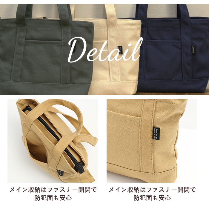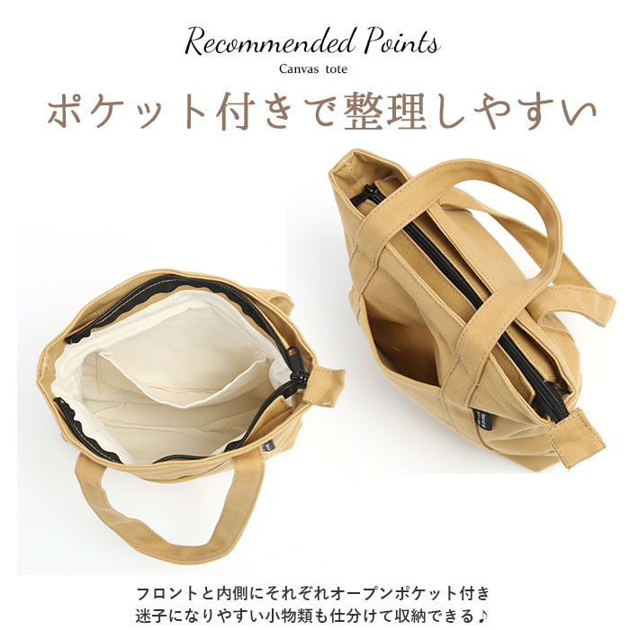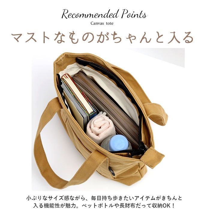 | 商品説明 | ころんとした小さめボディが可愛い、ミニトートバッグが新登場。小ぶりなサイズ感ながら、毎日持ち歩きたいアイテムがきちんと入る機能性が魅力。ペットボトルや長財布だって収納OK!開口部はファスナー仕様なので、しっかり収納できて目隠しにも。大切なプライバシーを守ることで防犯面でも安心。バッグ前面と内側にそれぞれオープンポケットが付いているから、迷子になりやすい小物類も仕分けて収納できる♪バッグインバッグとして使えば、いつものバッグの中もすっきり♪シンプルなデザインが映える厚手のキャンバス生地を使用。豊富なカラバリの中からお気に入りを見つけて! |