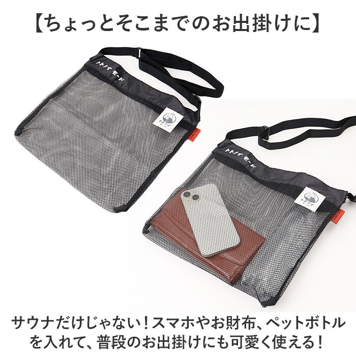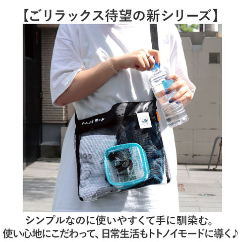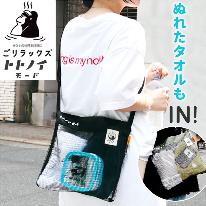 | 商品説明 | 【サウナーさんの日常を楽しく彩る♪】ごリラックスからサウナに行かない日もデイリーに使える!「トトノイモード ととのいサコッシュ」が登場!【ごリラックスとは・・・】サウナをテーマに、無口でシャイなゴリラのまもるさんが、いつもがんばっているあなたの心と身体を整えてくれる、ととのい系ブランド。【ごリラックス待望の新シリーズ】シンプルなのに使いやすくて手に馴染む。使い心地にこだわって、日常生活もトトノイモードに導く♪「トトノイモード」はごリラックス待望の新シリーズ。【マストなサウナグッズをひとまとめ】ほんのりマチを設けたスリム設計で、バスタオルやサウナハット等のグッズをミニマルに収納可能。【まもるさんグッズを可愛く魅せる】バッグ内のコミカルなまもるさんグッズが透けて見えるメッシュ仕様で、サウナーさんたちを魅了♪【両手が空いて、身軽にお出掛け】調節のできるショルダーベルトで、ふわっと肩掛けにできるので、両手が空いてストレスフリー。【メッシュ生地で通気性抜群!】通気性のよいオールメッシュ仕様だから、サウナ後の濡れたタオルなどがそのまま持ち帰れて楽ちん!【荷物が増えてもすっきりフォルム】丈夫なメッシュ素材を採用し、びよ~んと伸びがちな、メッシュバッグ特有のイライラを解消。※横方向にわずかに伸長し、縦方向には伸びにくいポリエステルメッシュを採用しているため、荷物をたくさん入れても下方向に伸びにくい造りです。【ちょっとそこまでのお出掛けに】サウナだけじゃない!スマホやお財布、ペットボトルを入れて、普段のお出掛けにも可愛く使える!【ごリラックスオリジナルデザイン】サウナハットの頭から湯気がほっこり!まもるさんのイラスト入りロゴパッチが印象的なアクセント。【コーデが引き立つ!シンプルカラー】お出掛けスタイルに馴染むアースカラーと、くっきり映えるトトノイモードのロゴが相性抜群。【忙しい日々にも、ごリラックスを】カラダもココロもすっきりととのう♪快適なサ活ライフを応援する、気軽に持てる軽量サコッシュ。「ごリラックス」はサウナーさんたちの合言葉! |