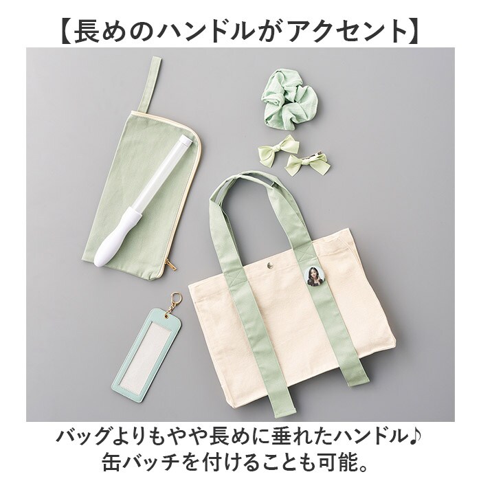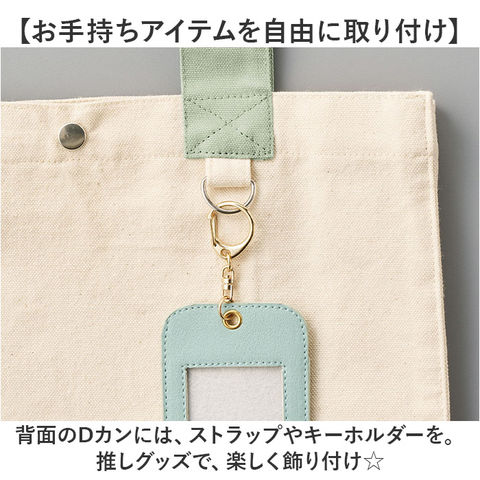 | 商品説明 | 【推し活を快適にサポートする相棒】推し活グッズをデコレーション☆持ち歩きも便利な、キャンバスカラーハンドルスクエアトート。【推し活も普段使いもお任せ☆】目立ちすぎないよう、ハンドル部分でカラー展開。仕事や学校後にそのまま現場へ直行も!【長めのハンドルがアクセント】バッグよりもやや長めに垂れたハンドル♪缶バッチを付けることも可能。【いつでもどこでも開け閉め簡単】開口部はスナップボタン式。いつでもサッと開け閉めでき、飛び出しをガード。【手軽に使えるちょうどいいサイズ感】B5がすっぽり。小さすぎず大きすぎない、マストアイテムがまとまる容量約9L。(※)A4もぴったり収まるサイズですが、開口部にひっかかる場合がございます。【サクッと取り出せて迷子知らず】内側にポケットを1つ配置。スマホなども、バッグの中で探す手間が不要。【お手持ちアイテムを自由に取り付け】背面のDカンには、ストラップやキーホルダーを。推しグッズで、楽しく飾り付け☆【推しカラーをさりげなく身につけて】推しのメンバーカラーを選べる、豊富なバリエーション。仲間とお揃いもおすすめ!【ポケット仕様】内側:オープンポケット×1 |
