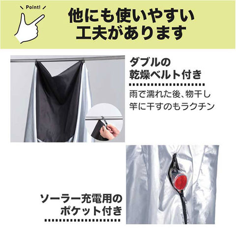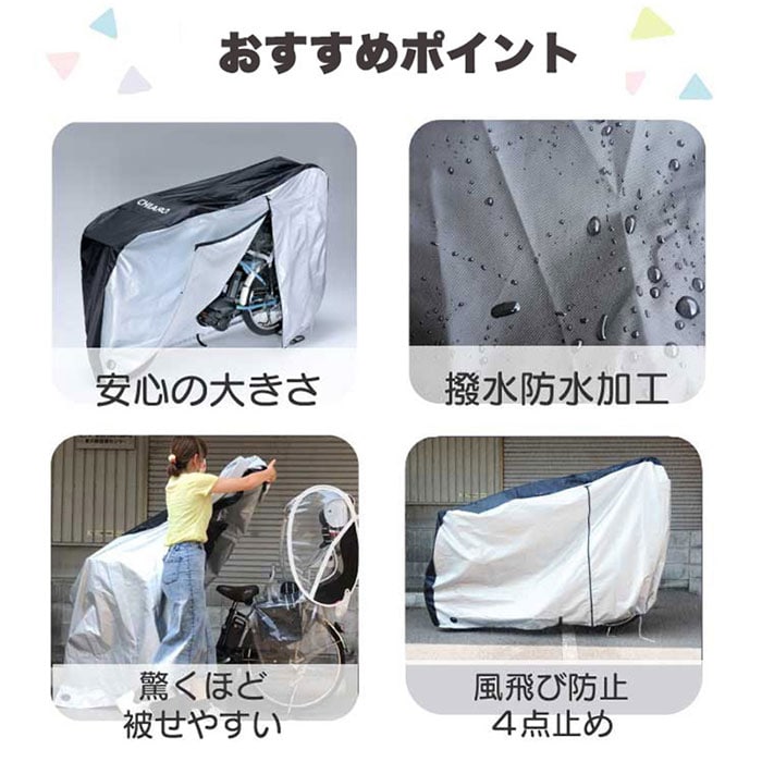 | 商品説明 | 【アシスト車3人乗り対応】電動自転車を雨風からしっかり守る大型サイクルカバー。【ゆったり大型設計】前後の子供乗せシートもすっぽり覆える大型設計で、電動自転車を丸ごと保護できる安心感◎【防水撥水のW加工】上部は防水&撥水、下部も撥水加工を施した生地で雨の日も自転車をしっかりガード〇【風に負けない構造】風飛び防止機能付きだから、強風の日でもカバーがめくれる心配なく駐輪場でも快適♪【丈夫な厚手素材】長く使える耐久性のある厚手生地で、大切な自転車を長期間しっかり守れる頼もしさ。 |