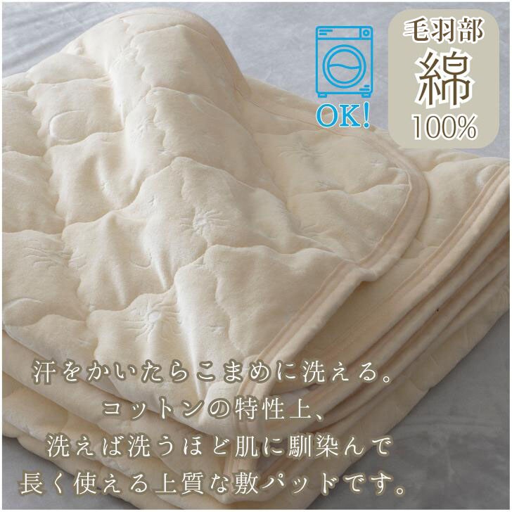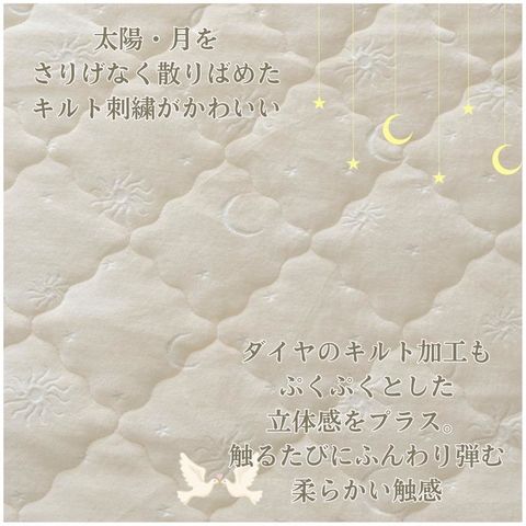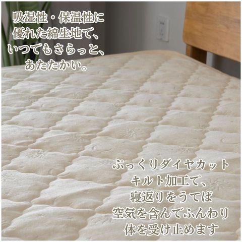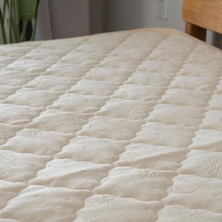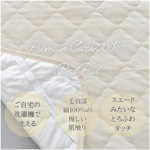 | 商品説明 | 毛羽部コットン100%でふっくら、優しい肌触り。肌もココロもいたわる優しい敷パッド♪上質な綿100%のキルト地を使用しており、肌触りがなめらかで心地よい寝心地を実現!太陽と月のかわいらしい刺繍は大人からお子様まで使いやすいデザイン(^^)通気性・保温性のバランスに優れ、一年を通して使用可能。秋冬の寝汗対策にも綿素材はマスト!シンプルでおしゃれなデザインは、北欧やモダンなインテリアにも馴染む。 |
