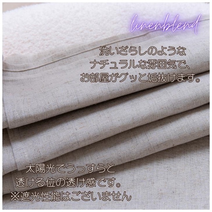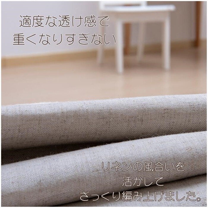 | 商品説明 | リネンブレンド生地で作られた、シンプルでナチュラルなデザインのカーテン。リビングや寝室、玄関など、さまざまな場所で目隠しや間仕切りとして使用可能。生地は洗濯機で洗えるので、お手入れが簡単。アイボリーとグレー2色展開で、お部屋の雰囲気を柔らかく演出。天然素材のリネン生地は、通気性と吸湿性に優れており、快適な空間を作り出す。つっぱり棒を使えば、簡単に設置できるのも魅力的。 |