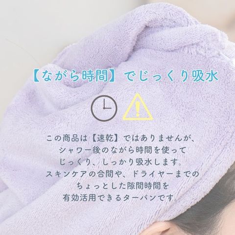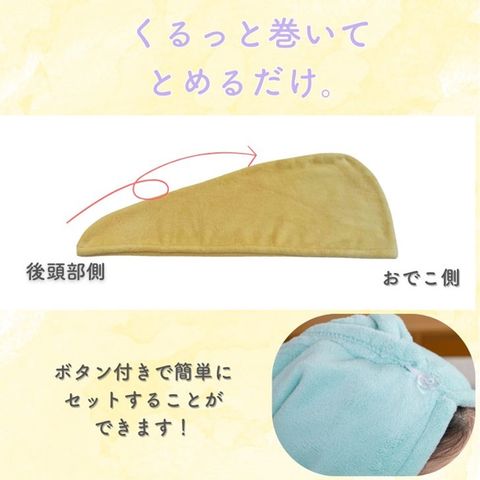 | 商品説明 | 驚きの吸水性!いつものスキンケアタイムや家事の【ながら時間に】にくるっと巻くだけ♪洗い髪の水分をじっくり吸収。 |