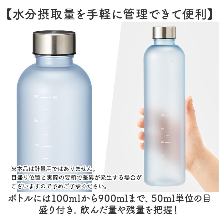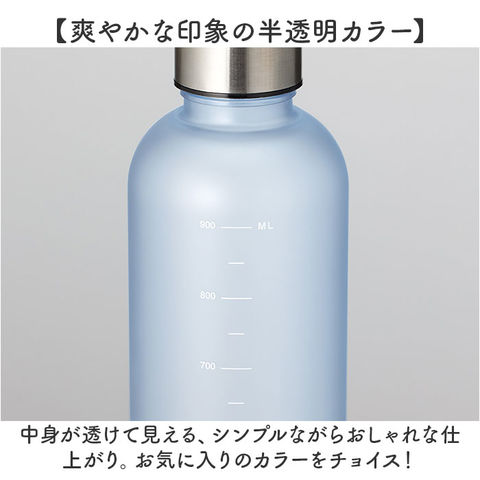 | 商品説明 | 【日々の水分補給を簡単サポート】必要な水分量をしっかり摂って、健康習慣☆「目盛り付フロストボトル」1000mlサイズ。【水分摂取量を手軽に管理できて便利】ボトルには100mlから900mlまで、50ml単位の目盛り付き。飲んだ量や残量を把握!【シェイカー代わりに使ってもOK】プロテインなど、分量の目安を確認するドリンク作りにも対応できるのが嬉しいポイント。【ダイレクトにゴクゴク水分補給】フタを回すだけで簡単オープン。いつでもどこでも直飲みできるフロストボトル。【たっぷり入るのに、とっても軽量】大満足の容量1000ml。軽やかで持ち運びしやすく、通勤通学、ジムなどのお供にも。(※)構造上、目盛りは900mlまでの印字となります。【爽やかな印象の半透明カラー】中身が透けて見える、シンプルながらおしゃれな仕上がり。お気に入りのカラーをチョイス! |