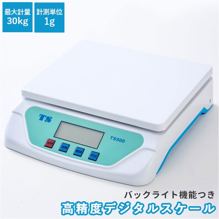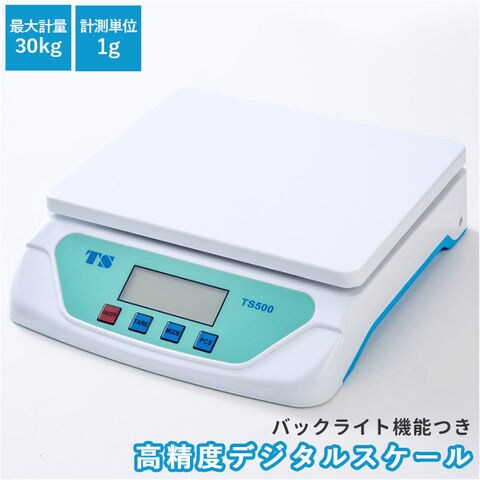 商品説明コンパクトなのに、最大計量30kg!重いものもしっかり測れる「高精度デジタルスケール」が新登場。1g(0.01kg)から30kgまで、1g単位で幅広く計測が可能。約750gの軽量構造なので、女性でも持ち運びがラクラク。小さな計測物でもはっきりと見やすいホワイトカラーのボディに、バックライト付き液晶の画面で、照明の少ない作業所や、夕方仄暗い屋外での作業でも使い勝手が抜群!調味料や食材を計量するときに、トレーや器の重量を自動的にマイナスして計量ができる「TAREボタン」(風袋差し引き機能ボタン)搭載。さらに、「PCSボタン」(数量カウント機能ボタン)を使用すれば、数が多く、全て同じ重さの小物の個数をカウントする際にとっても便利。(※PCSボタンの使用方法については、使用方法欄をご覧ください。)約60秒間操作を行わないと自動的に電源がOFFになる、オートパワーオフ機能付きだから、とってもエコ。(使用電池:単3型乾電池×2本使用。電池は別売りです。)ご自宅のキッチンで食材の計量はもちろん、農作物の袋詰めや宅配物の重量計算まで、業務用途でも活躍するパワフル性能。