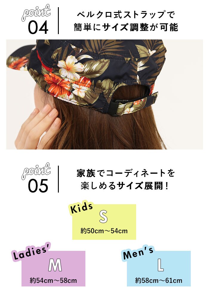 | 商品説明 | シンプルなシルエットがメンズだけでなく、女性にも人気!デザインと機能性にこだわったはっ水ワークキャップ。表面にはっ水加工を施したポリエステル素材を採用。突然の雨に降られた時やアウトドアでアクティブに活動したい時も安心。しっかりと水をはじくので、泥はねやシミなどの汚れにも強い。紫外線99.9%カットする生地なのでUVケアも万全!お肌がデリケートな女性やお子さまにもオススメ!頭の形にフィットするシンプルな円筒形のフォルムと、緩やかにカーブのかかったバイザー。ジーンズやTシャツなど、気取らないいつものスタイルに合わせやすい。内側には全面にメッシュ生地を使用。左右にメッシュ素材の通気窓付きで、熱中症が気になる季節でも着用しやすいよう通気性を確保。(メッシュ素材の色はカラーにより異なります)背面のベルクロ式ストラップで簡単にサイズ調整が可能。Sサイズ(頭囲54cm)、Mサイズ(頭囲58cm)、Lサイズ(頭囲61cm)の3サイズ展開でご家族でコーディネートできるのが嬉しい!(※Sサイズはキッズサイズ。Mサイズはレディースサイズです。)ペイズリーやドットなどシンプルな柄は普段使いに。夏らしさを感じるボタニカルやタイダイ柄はリゾートにもぴったり! |