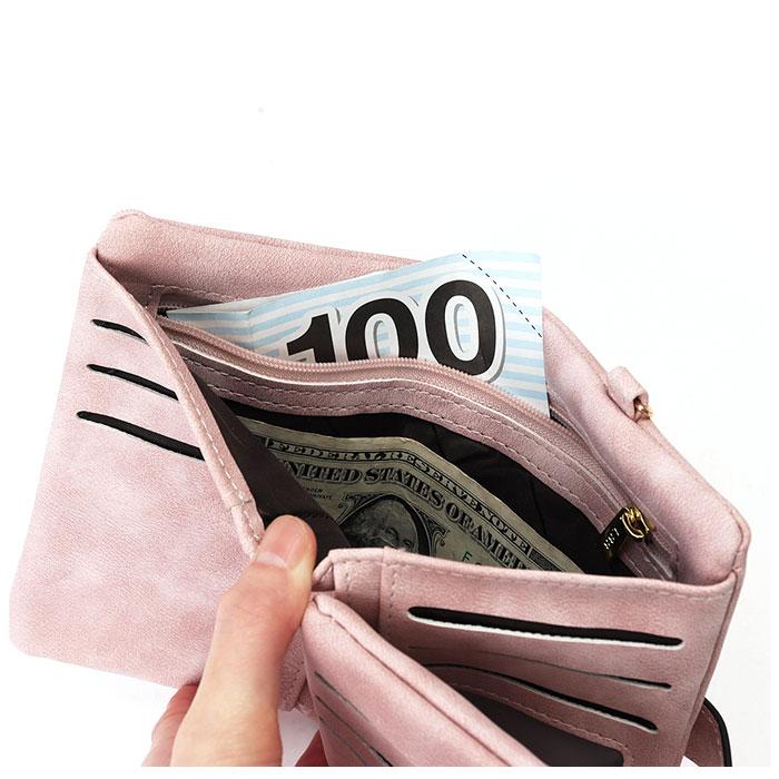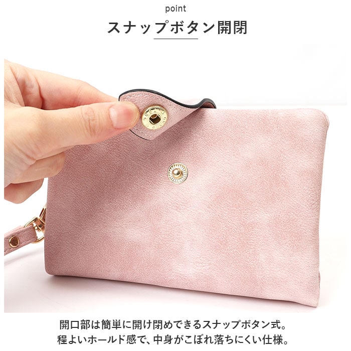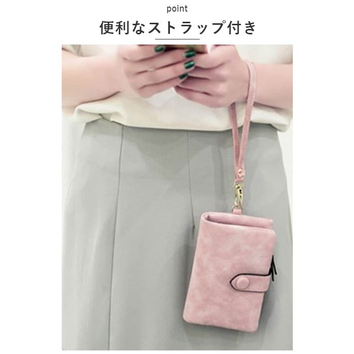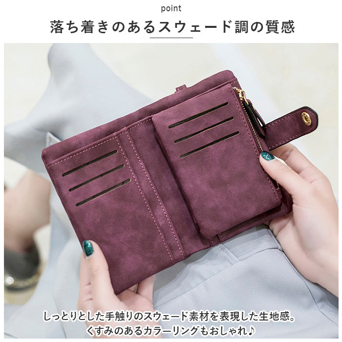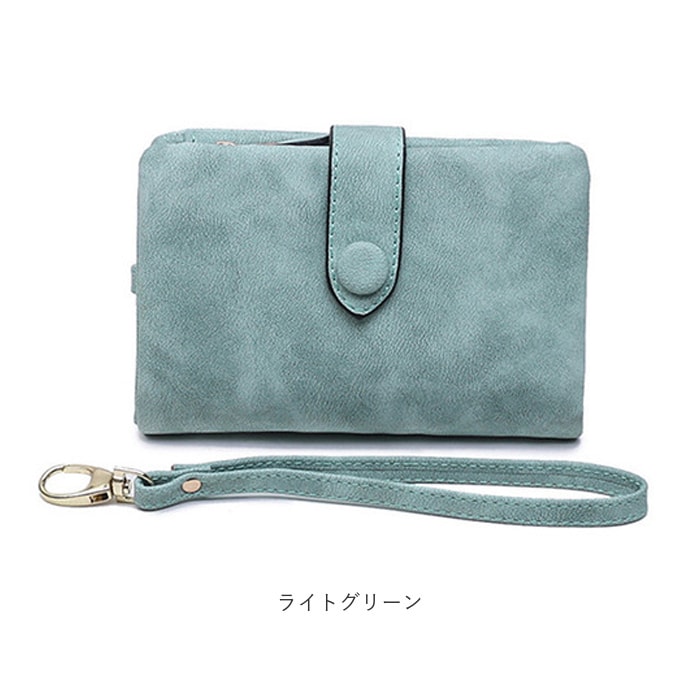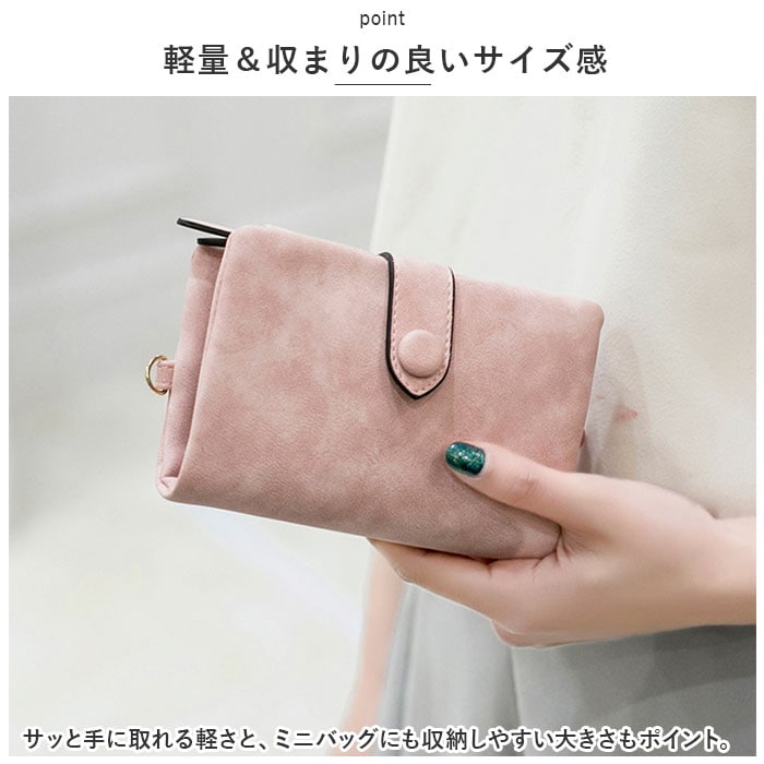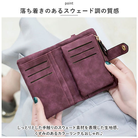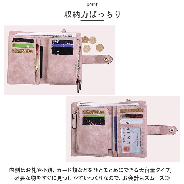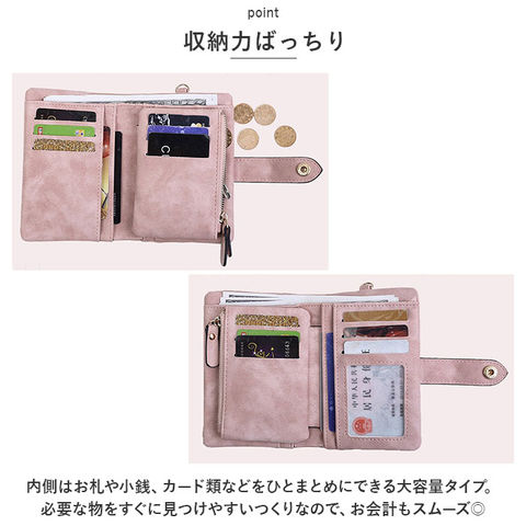 | 商品説明 | 現金やカードがたっぷり入ってすっきりまとまる♪使い勝手の良い、二つ折りタイプの財布が登場。【落ち着きのあるスウェード調の質感】しっとりとした手触りのスウェード素材を表現した生地感。くすみのあるカラーリングもおしゃれ♪【軽量&収まりの良いサイズ感】サッと手に取れる軽さと、ミニバッグにも収納しやすい大きさもポイント。【スナップボタン開閉】開口部は簡単に開け閉めできるスナップボタン式。程よいホールド感で、中身がこぼれ落ちにくい仕様。【収納力ばっちり】内側はお札や小銭、カード類などをひとまとめにできる大容量タイプ。必要な物をすぐに見つけやすいつくりなので、お会計もスムーズ◎【便利なストラップ付き】サイドのDカンに付属のストラップ紐を取り付け♪ストラップを手首に通せば、手持ちもラクラク。【ポケット仕様】内側:お札入れ×1、ファスナーポケット×2、フリーポケット×4、カードポケット×12(1つは半透明窓タイプ) |