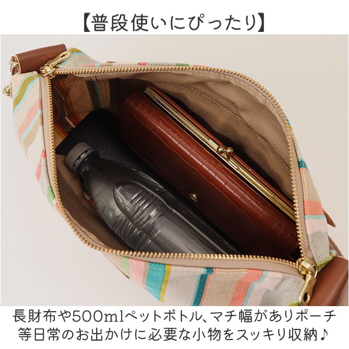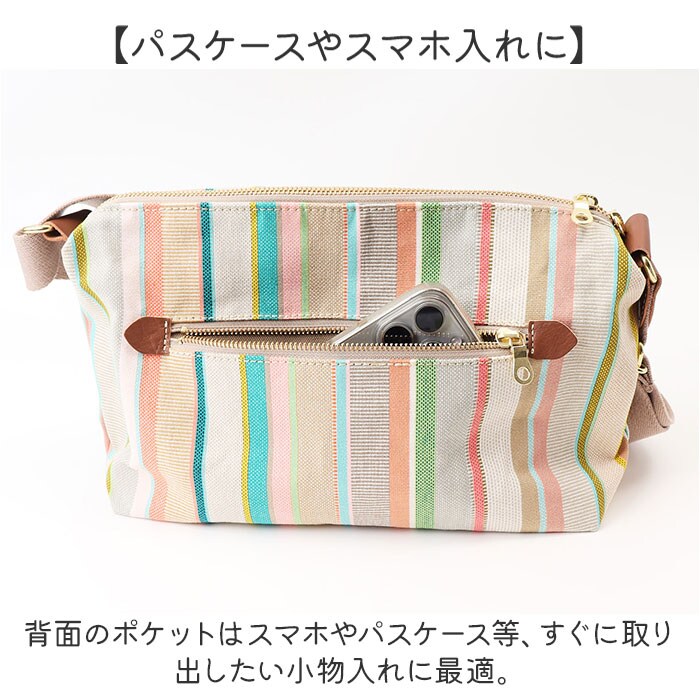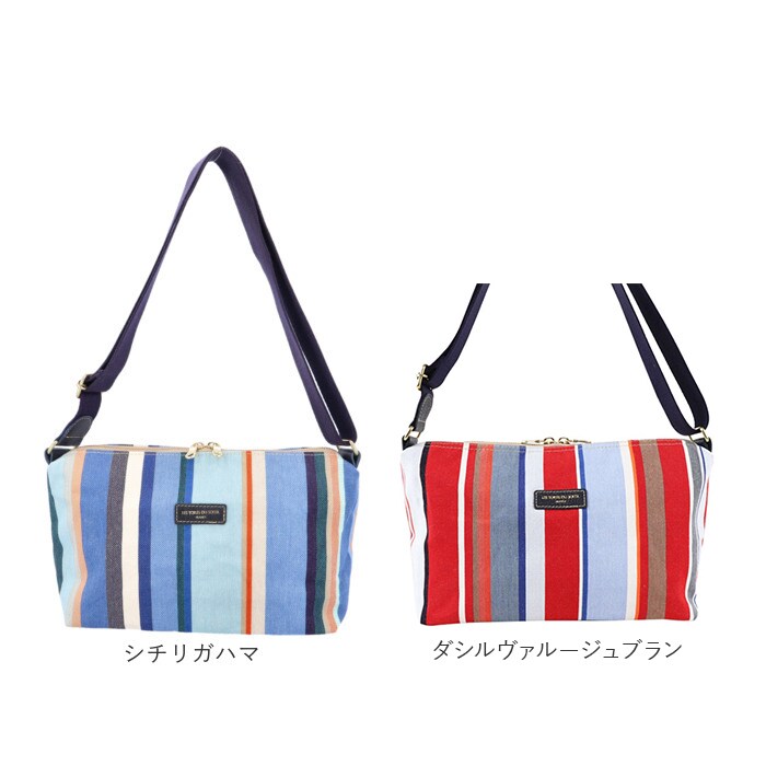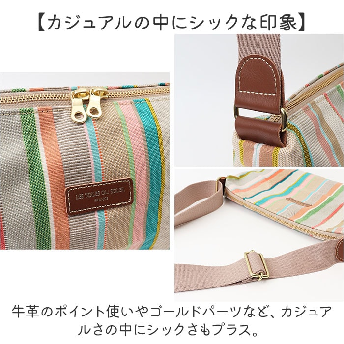 | 商品説明 | 【鮮やかな色彩が魅力】フランス政府認定!老舗メーカーが紡ぐストライプの生地を使ったショルダーバッグSが登場。【レ・トワール・デュ・ソレイユ】・160年を超える歴史を持つテキスタイルメーカーが発信しているブランド。【フランス政府認定の生地】伝統的な製法を用いて紡がれた、フランスらしい配色のストライプの生地は重要文化財に認定。【普段使いにぴったり】長財布や500mlペットボトル、マチ幅がありポーチ等日常のお出かけに必要な小物をスッキリ収納♪【迷子になりがちな小物入れに】内側にオープンポケットを搭載。迷子になりがちな小物を分けて収納。【パスケースやスマホ入れに】背面のポケットはスマホやパスケース等、すぐに取り出したい小物入れに最適。【斜め掛けもできるショルダー】ショルダーベルトは長さ調節ができ、お好みに合わせて斜め掛けも肩掛けスタイルも◎【少しの雨や汚れを弾く】パラフィン加工が施されており撥水・防汚性も◎多少の汚れや雨ならサッと拭き取れる※1【自立もでき置き場所に困らない】底板が付いているので自立も可能!椅子などちょっとしたスペースに置ける。※2【カジュアルの中にシックな印象】牛革のポイント使いやゴールドパーツなど、カジュアルさの中にシックさもプラス。【ポケット仕様】メインルーム・・・オープンポケット×1背面・・・ファスナーポケット×1【注意事項】※1 完全防水ではございません。長時間雨や水分に当たると浸水する場合がございます。またパラフィンは自然経過によりコーティングが?がれていきます。ご了承ください。【付属品】※2 底板(取り外し可能) |