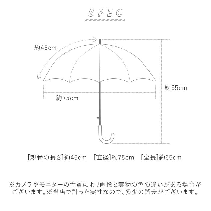 | サイズ | [親骨の長さ]約45cm/[直径]約75cm/[全長]約65cm ※サイズは当店計測の実寸サイズです。実際の商品ならびにメーカー表記サイズとは多少の誤差が生じる場合がございます。あらかじめご了承ください。 |