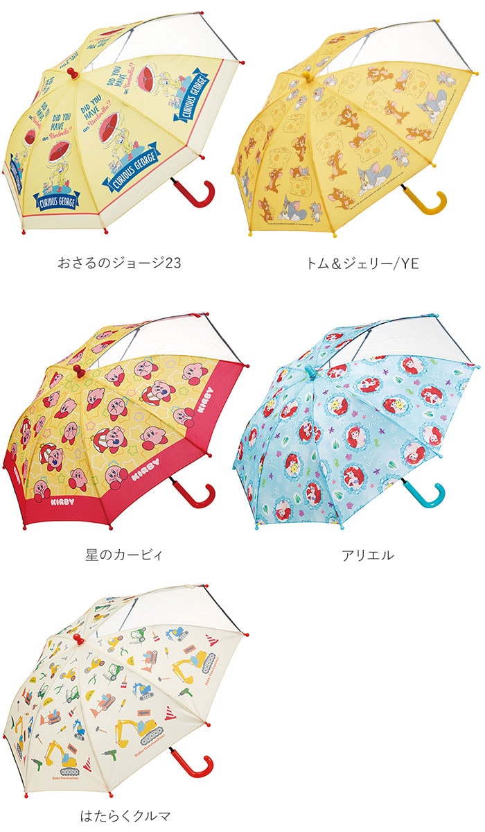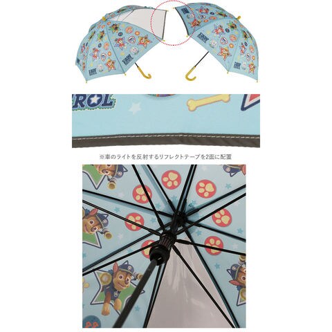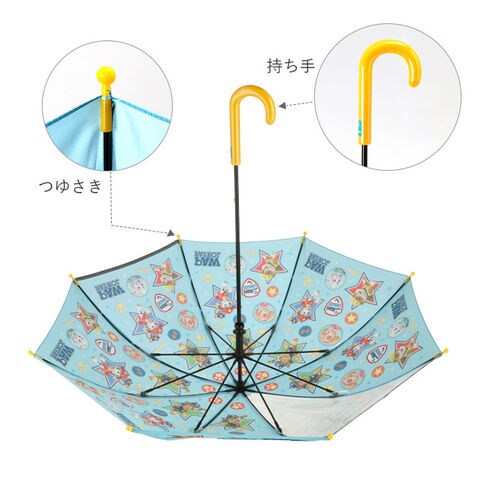 | 注意点 | 本製品はお子様用です。製品には尖った部分があります。周りの人や物にあたらないよう、周囲の安全を確認してからご使用ください。製品の手元や骨が折れたりした場合には、怪我や事故になる恐れがあるため、使用を中止してください。強風の時は、製品が破損する恐れがありますので使用しないでください。製品をステッキとして使用するなど、傘本来の目的以外での使用は止めてください。製品は、自転車・ベビーカー等と固定する器具に取り付けて使用する構造になっておりません。視野の妨げ、事故・破損の原因となる恐れがありますので、絶対に取り付けないでください。製品には、構造上、骨同士が狭くなっているので、骨に挟まれたり怪我をする恐れがありますので、手や指を入れないでください。ハンドクリームや日焼け止めクリーム等が、製品の生地・手元等の色落ちの原因になる場合があります。ご使用後は、製品を陰干しにして乾かしてから保管してください。濡れたまま保管しますと、錆の発生や生地の色移りの原因となる場合があります。お子様がお使いの際には、保護者の指導のうえでご使用ください。傘の開閉時は顔や身体を離して使用してください。直射日光をさけて保管してください。グラスファイバー骨部分が破損した場合はトゲが刺さる場合がありますので、破損部分を直接触らないようにしてください。誤った使用方法に起因する損害は一切補償いたしません。カメラやモニターの性質により、画像と実物の色の違いがある場合がございますのでご理解願います。 |