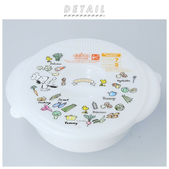| 注意点 | 加熱直後は容器が熱くなり、蒸気等による火傷の危険があります。湯切りの際、取り出しの際は十分ご注意ください。取り出しの際は持ち手部分が熱いので、ぬれ布巾等でつかんでお持ちいただくと安全です。生卵を容器の中に入れて電子レンジで加熱する時は、必ず割りほぐしてください。生卵をそのまま容器に入れただけでゆで卵(殻付き・殻なし)の加熱もしないでください。破裂してやけどやけがをすることがあります。自動食器洗浄機、食器乾燥機は絶対使用しないでください。スポンジや柔らかい布に食器中性洗剤をつけ、ぬるま湯で洗ってください。アルカリ洗剤又はオレンジオイル系洗剤は図柄剥離、変色する事がありますので使用しないでください。タワシ、磨き粉などでみがかないでください。空焚きはしないでください。ニオイが強すぎるもの、容器にニオイがついてなかなかとれないことがありますが、品質上問題はありません。食材、調味料によっては、色素が容器に付着する場合がありますが、品質上問題はありません。[電子レンジでのお取り扱い上の注意]空焚きはしないでください。電子レンジ加熱後は容器が熱くなっておりますので、火傷に注意してください。フタを外して使用してください。高周波加熱専用であるため、直火、オーブン及びグリルでの使用はしないでください。オート加熱、おまかせ加熱では使用しないでください。カメラやモニターの性質により、画像と実物の色の違いがある場合がございますのでご理解願います。 |