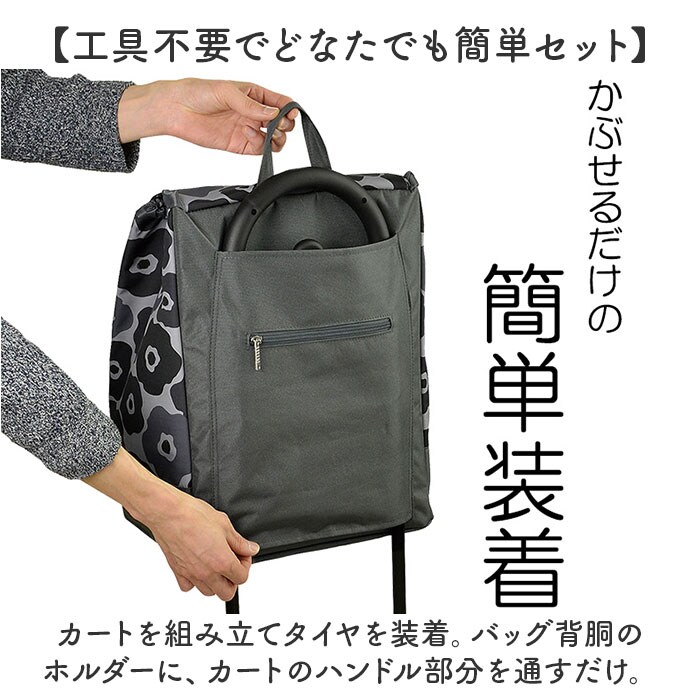 | 商品説明 | 【コロコロ軽がせてノンストレス】重たい荷物もサクッと持ち運べる、心強い相棒☆「シャルミス ショッピングカート」。【様々なシーンで使える万能アイテム】お買い物やレジャー、アウトドアシーンで大活躍!耐荷重は10kgで、荷物が増えても大丈夫。【スマートにお買い物できて便利】・2つのフックで、お店のレジカゴカートに引っ掛けOK。置き場を気にせずお買い物♪(※1)カートの形状によっては取り付けできない場合があります。【うれしい簡易保冷機能を搭載】内側にアルミ蒸着フィルムを使用し、生鮮食品の持ち運びも安心◎ポケットには保冷剤をIN。(※2)長時間の保冷効果を保証するものではございません。【お弁当類や飲料も楽々持ち運び】マチ広で取り外し可能な底板付き。スーパーのお弁当やペットボトルのドリンクも収納可能。【キュッと絞ってフラップをON】荷物の量に合わせて、ドローコードの絞り具合を調節。フラップとWで冷気を逃しにくい!【サッと取り出せる背面ポケット】お財布や、折りたたみ式のエコバッグなどが入るポケット。ファスナーでこぼれ落ちもガード。【大きなタイヤで安定した走行】幅広&大きめサイズのタイヤ。スムーズに転がすことができ、小さなストレスも軽減。【手荷物を掛けておけるフック付き】ハンドル部分にフックを装備。荷物が増えてしまった時もフックに掛ければ、両手が空いて快適。【工具不要でどなたでも簡単セット】カートを組み立てタイヤを装着。バッグ背胴のホルダーに、カートのハンドル部分を通すだけ。【ちょっとの雨なら大丈夫】バッグ生地は水滴や汚れを弾く、撥水加工済み。お手入れも拭き取るだけ。(※3)完全防水ではありません。【気分の上がる可愛い花柄デザイン】シンプルながら大胆なデザインが魅力♪落ち着きのある大人なカラーをラインナップ。【ポケット仕様】バッグ内側:メッシュポケット×1バッグ背面:ファスナーポケット×1 |