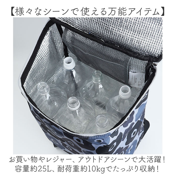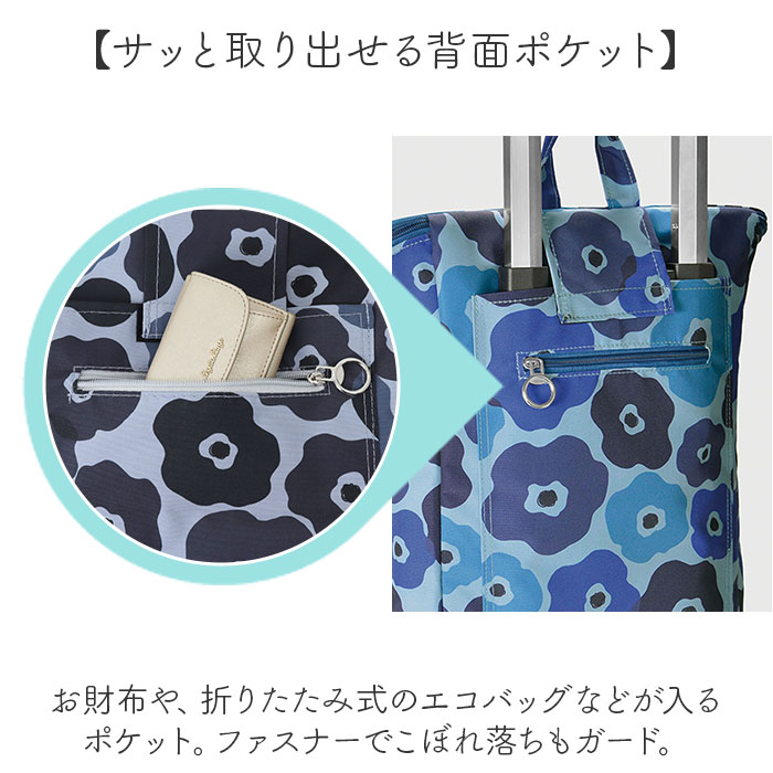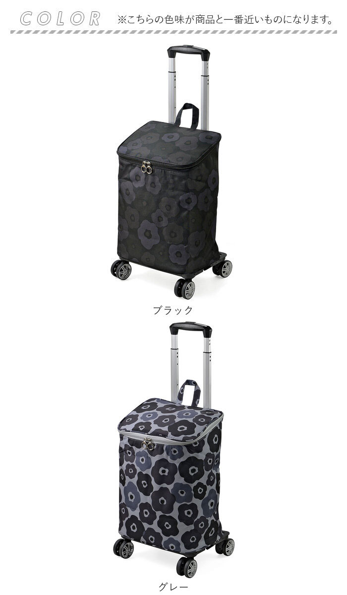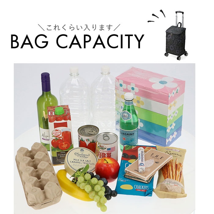 | 商品説明 | 【台車のように押してノンストレス】重たい荷物もサクッと持ち運べる、心強い相棒☆「シャルミス 4輪ショッピングカート」。【様々なシーンで使える万能アイテム】お買い物やレジャー、アウトドアシーンで大活躍!容量約25L、耐荷重約10kgでたっぷり収納!【スマートにお買い物できて便利】360度回転するタイヤ。前後左右移動できるから狭い通路でもスムーズに方向転換。【4輪カートで安定感抜群】フラットな台にバッグを置く設計だから安定感◎バランスがとりやすく、カートが倒れにくい!【うれしい簡易保冷機能を搭載】内側にアルミ蒸着フィルムを使用し、生鮮食品の持ち運びも安心◎ポケットには保冷剤をIN。(※1)長時間の保冷効果を保証するものではございません。【お弁当類や飲料も楽々持ち運び】マチ広で取り外し可能な底板付き。スーパーのお弁当やペットボトルのドリンクも収納可能。【ダブルファスナーで大きく開く】指を引っかけて開閉しやすいリングファスナー仕様。しっかり閉めれば冷気を逃しにくい!【サッと取り出せる背面ポケット】お財布や、折りたたみ式のエコバッグなどが入るポケット。ファスナーでこぼれ落ちもガード。【腰や肩の負担を軽減♪】握り部分のボタンを押せばハンドルの長さは3段階に調節可能。押す際の姿勢をキープ。【工具不要でどなたでも簡単セット】背面フレームを立てて固定具を差し込み、フレームにバッグを通したら面ファスナーで留めるだけ(※2)背面フレームは繰り返し折りたたむことを想定していないため、なるべく立ち上げたまま保管してください。【ちょっとの雨なら大丈夫】バッグ生地は水滴や汚れを弾く、撥水加工済み。お手入れも拭き取るだけ。(※3)完全防水ではありません。【気分の上がる可愛い花柄デザイン】シンプルながら大胆なデザインが魅力♪落ち着きのある大人なカラーをラインナップ。【ポケット仕様】バッグ内側:メッシュポケット×1バッグ背面:ファスナーポケット×1 |