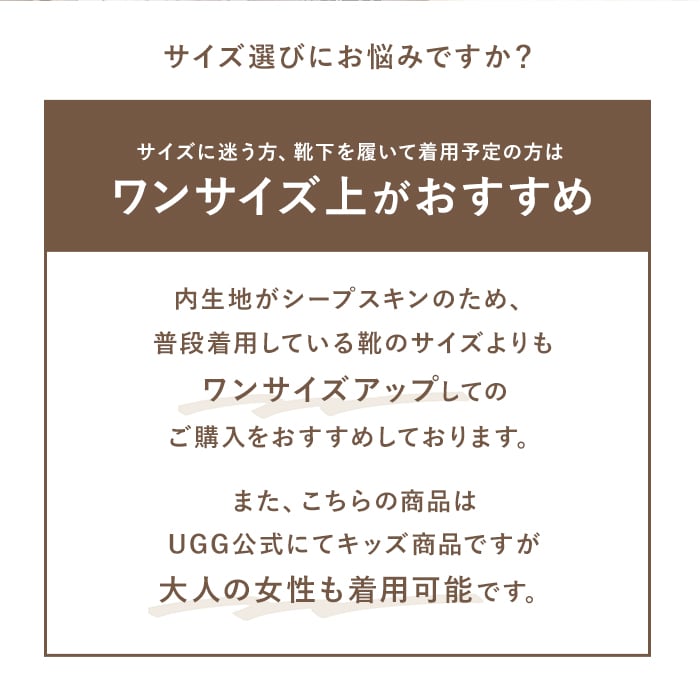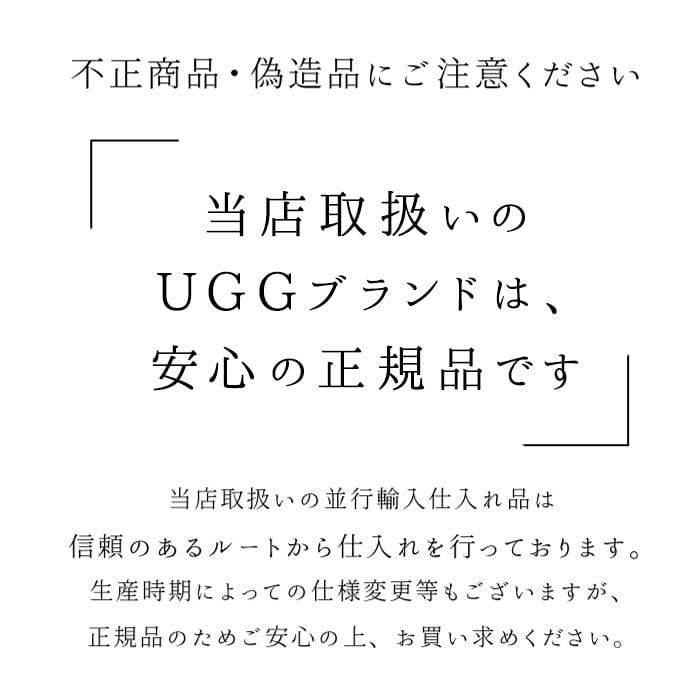 | 注意点 | 素材の風合いを損なわないよう染色しております為、色の個体差や摩擦・湿気などによる色落ち・色移りの可能性がございます。ご使用時や収納の際にはご注意ください。こちらの商品はUGGのKIDSモデルです。海外の子供向け規格のため、子供向けサイズとしては大きなつくりですが、日本人の女性に着用しやすいサイズ感となっております。カメラやモニターの性質により、画像と実物の色の違いがある場合がございますのでご理解願います。 |