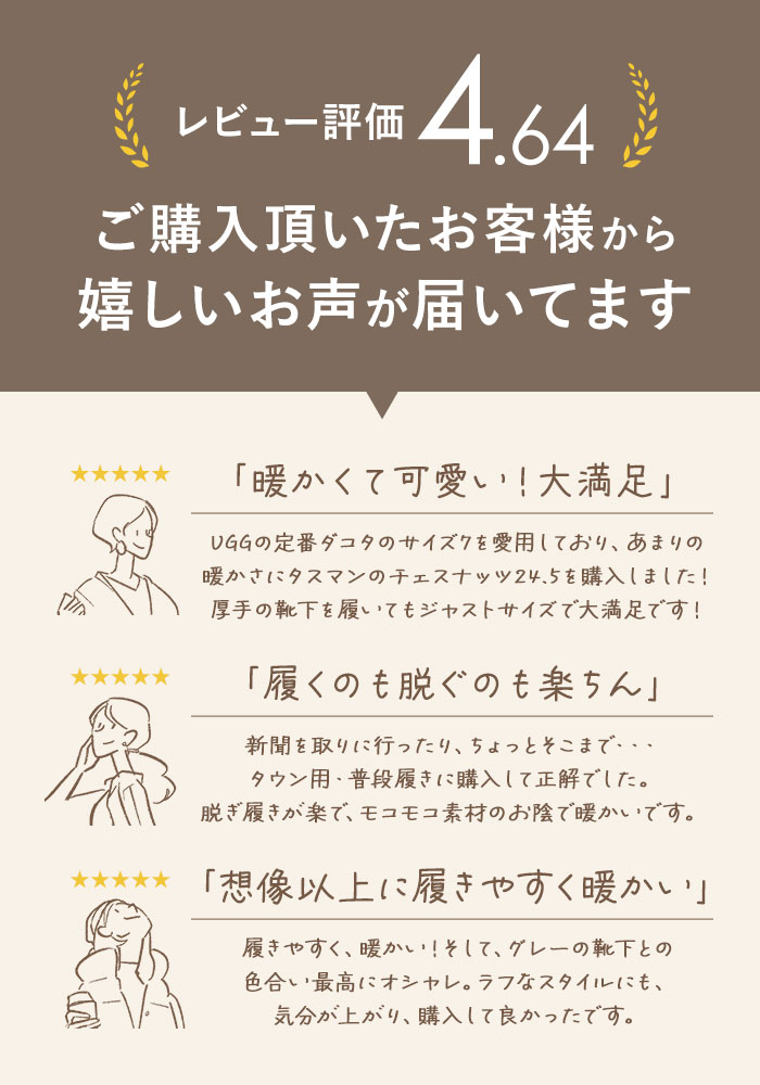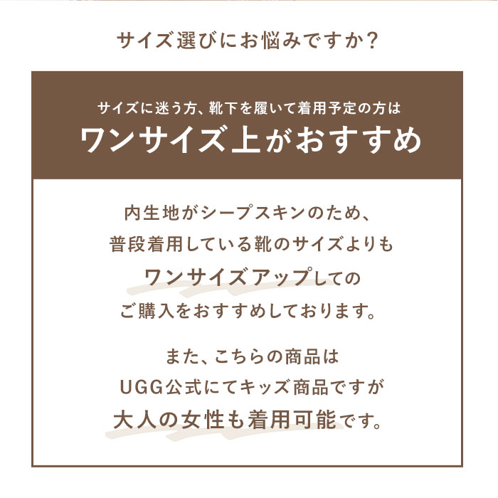 | 注意点 | 素材の風合いを損なわないよう染色しております為、色の個体差や摩擦・湿気などによる色落ち・色移りの可能性がございます。またアッパーは水濡れに弱い性質ですので、ご使用時や収納の際にはご注意ください。こちらの商品はUGGのKIDSモデルです。海外の子供向け規格のため、子供向けサイズとしては大きなつくりですが、日本人の女性に着用しやすいサイズ感となっております。カメラやモニターの性質により、画像と実物の色の違いがある場合がございますのでご理解願います。 |