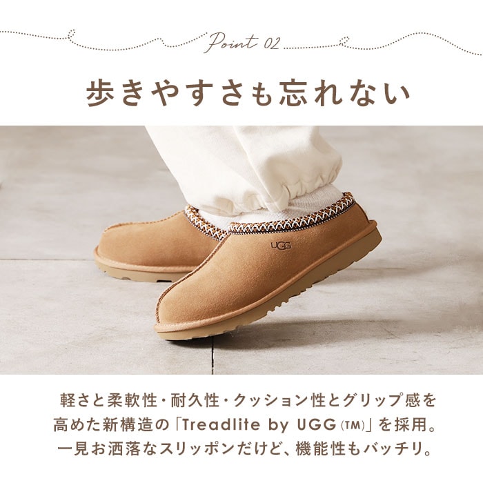 | 素材 | [アッパー]カウスエード [ライニング]シープスキン [インソール]天然ウール [アウトソール]Treadlite by UGG(TM)※ ※トレイドライト・バイ・アグ:軽さと柔軟性・耐久性・クッション性とグリップ感を高めた新構造のアウトソール |