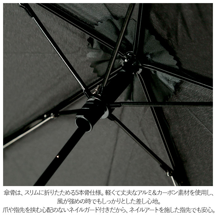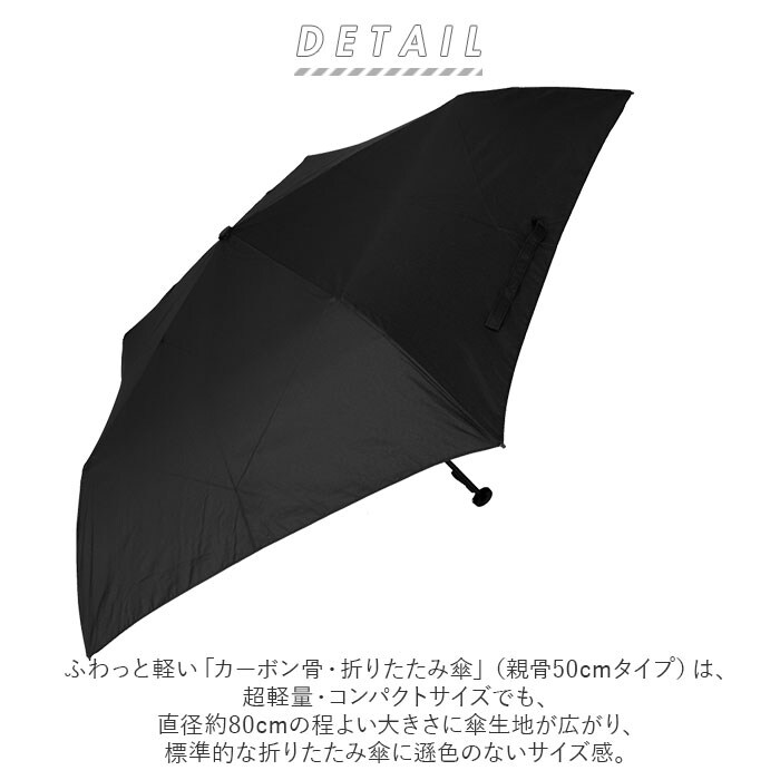 | 商品説明 | 持ち運び時のストレスフリー!ふわっと軽い「カーボン骨・折りたたみ傘」(親骨50cmタイプ) が新登場。重量は一般的なスマホよりも軽い、わずか約84g。小さめショルダーバッグにもすっぽりと収納でき、持っていることを忘れるほどの驚きの軽さ。傘骨は、スリムに折りたためる5本骨仕様。軽くて丈夫なアルミ&カーボン素材を使用し、風が強めの時でもしっかりとした差し心地。傘骨をポキポキと折る手間のない手開き&簡単開閉タイプなので、急な雨でもサッと傘を広げられるのが嬉しいポイント。超軽量・コンパクトサイズでも、直径約80cmの程よい大きさに傘生地が広がり、標準的な折りたたみ傘に遜色のないサイズ感。爪や指先を挟む心配のないネイルガード付きだから、ネイルアートを施した指先でも安心。ONでもOFFでも使いやすいシンプルなユニセックスカラーでコーディネート自在。 |