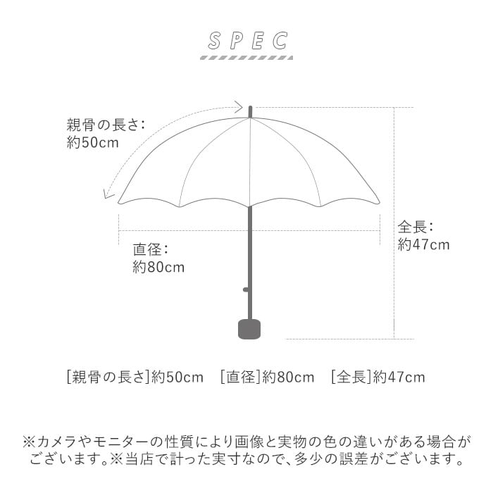| サイズ | [親骨の長さ]約50cm/[直径]約80cm/[全長]約47cm [収納時の長さ]約21cm [収納時の幅]約5cm ※サイズは当店計測の実寸サイズです。実際の商品ならびにメーカー表記サイズとは多少の誤差が生じる場合がございます。あらかじめご了承ください。 |
