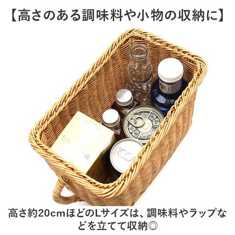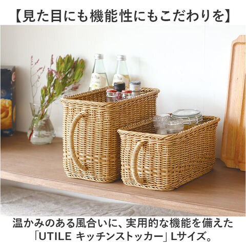 | 商品説明 | 【見た目にも機能性にもこだわりを】温かみのある風合いに、実用的な機能を備えた「UTILE キッチンストッカー」Lサイズ。【天然素材のようなナチュラル感】ポリプロピレンとポリエチレンを使って手編み。生活感が出にくく、見せる収納に最適。【型崩れしにくく丈夫】枠組み部分にはアイアン素材を使用し、しっかりとしたつくりに。【水洗いできてお手入れラクラク】汚れやホコリなどが気になったら、拭き取ったり水洗い。お手入れしやすく、衛生面も安心。【洗面などの水回りでも大活躍】天然素材のようにカビや虫、湿気を気にする心配なし。【高さのある調味料や小物の収納に】高さ約20cmほどのLサイズは、調味料やラップなどを立てて収納◎【リビングなど様々な場所で重宝】リモコンや充電器をまとめたり、コスメやスキンケアボトルを入れてもOK。【高い所に置いても出し入れ簡単】サッと手に取れる取っ手付き。ガラスキャビネットやオープン棚の収納に。【本物のカゴの風合いを表現】よりナチュラルな色味を再現。無垢材の棚や和食器との相性も抜群。【どんな空間にも素敵にマッチ】飽きが来ず、空間に馴染んで長く愛用できる♪お気に入りのアイテムで、お家時間をより豊かに。 |