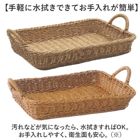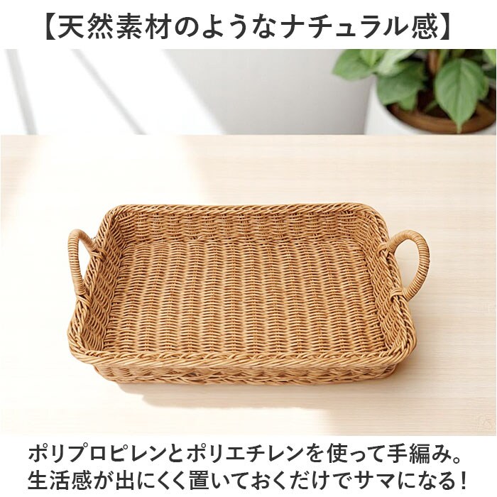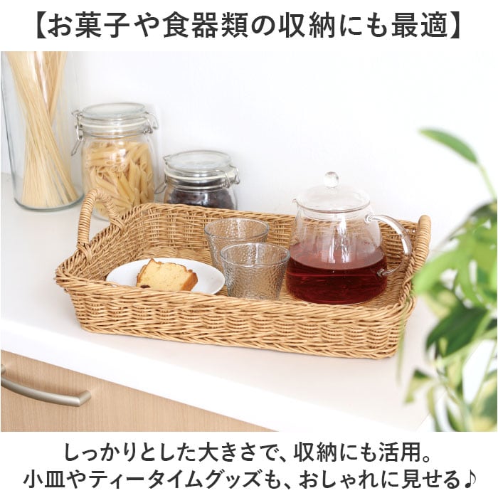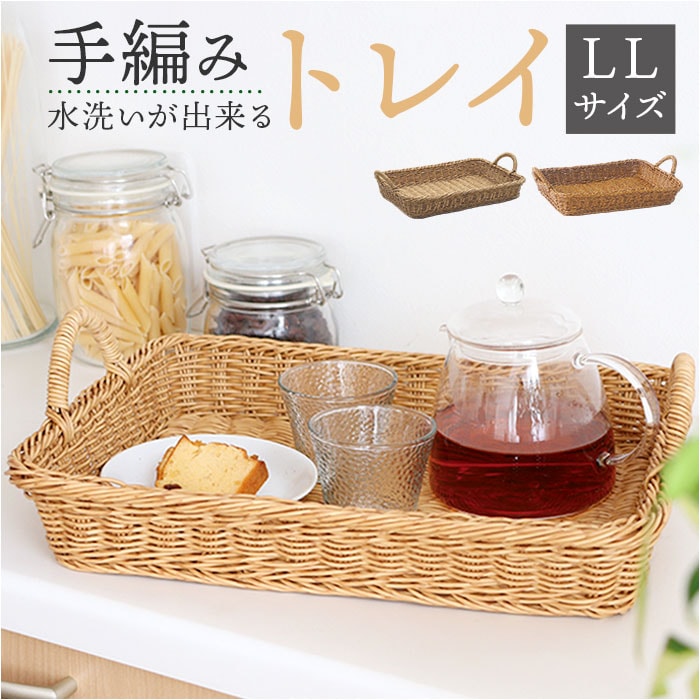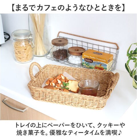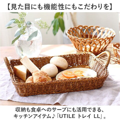 商品説明【見た目にも機能性にもこだわりを】収納も食卓へのサーブにも活用できる、キッチンアイテム♪「UTILE トレイ LL」。【天然素材のようなナチュラル感】ポリプロピレンとポリエチレンを使って手編み。生活感が出にくく置いておくだけでサマになる!【水に強く、濡れても大丈夫】天然素材のようにカビや虫、湿気を気にする心配なし。ちょこっと濡れてもへっちゃら。【型崩れしにくく丈夫なつくり】枠組みにアイアン素材を使用し、フォルムをキープ。長く愛用してもへたりにくい◎【まるでカフェのようなひとときを】トレイの上にペーパーをひいて、クッキーや焼き菓子を。優雅なティータイムを満喫♪【お菓子や食器類の収納にも最適】しっかりとした大きさで、収納にも活用。小皿やティータイムグッズも、おしゃれに見せる♪【サッと手に取れて移動もラクラク】両サイドに持ち手付き。安定した状態で移動できるのが嬉しいポイント。【手軽に水拭きできてお手入れが簡単】汚れなどが気になったら、水拭きすればOK。お手入れしやすく、衛生面も安心。(※)濡れた状態で放置しないでください。【どんな空間にも素敵にマッチ】飽きが来ず、空間に馴染むデザイン♪お気に入りのアイテムで、お家時間をより豊かに。