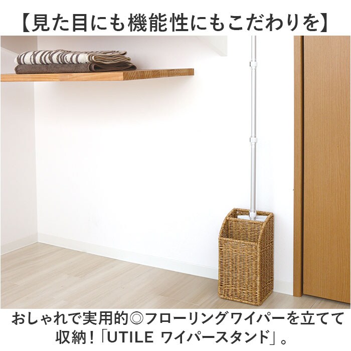 | 商品説明 | 【見た目にも機能性にもこだわりを】おしゃれで実用的◎フローリングワイパーを立てて収納!「UTILE ワイパースタンド」。【天然素材のようなナチュラル感】ポリプロピレンとポリエチレンを使って手編み。生活感が出にくく置いておくだけでサマになる!【水に強く、濡れても大丈夫】天然素材のようにカビや虫、湿気を気にする心配なし。水拭きや水洗いできてお手入れ簡単。(※)濡れた状態で放置しないでください。【型崩れしにくく丈夫なつくり】枠組みにアイアン素材を使用し、フォルムをキープ。長く愛用してもへたりにくい◎【差し込むだけでノンストレス】取り出しも収納も、サッと差し込むだけでOK。長いワイパーもぐらつくことなく安定。【取り替えシートも一緒に収納】取り替え用のシートを入れておける、サブポケット付き。スムーズにお掃除をスタート!【出しっぱなしでも自然に溶け込む】奥行約14cmのスリム設計。圧迫感がなく、見える位置に置いたままでも違和感なし♪【ワイパー以外にも、用途いろいろ】ハンディモップなどのお掃除道具、キッチンのカトラリースタンドとしても重宝。【どんな空間にも素敵にマッチ】飽きが来ず、インテリアの邪魔をしないデザイン♪お気に入りアイテムでお家時間をより豊かに。 |
