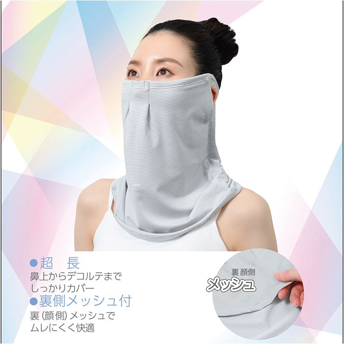 | 商品説明 | 顔からデコルテまでの日焼け対策に!「フィットスタイル フェイスカバー」メッシュ付タイプが新登場。【鼻上からデコルテをしっかりカバー】サッと頭から被って、耳掛け部分に耳を掛けるだけ。裾部分までたっぷり台形型にデザインされ、鼻上からデコルテの広範囲をカバー。【紫外線からお肌を守る強い味方】UVカット率約95%以上、UPF50+!日差しをガードしてくれて、屋外で長時間過ごす日などにぴったり。【いや~なムレやベタつきをガード】顔に当たる部分(顔側裏面)はメッシュ仕様。ムレを軽減できてベタつかない!【汗をかいてもサラッと快適】メッシュ部分以外は、ひんやり接触冷感◎汗ばむ季節もストレスフリー。【鼻部分のタックで通気性をプラス】鼻部分にタックを入れることで、通気性がアップ。顔を覆っても息苦しさを感じず着用可能。【ネックガードとしても重宝】顔から下げて、ネックガード代わりにも。シーンに合わせて使い方をアレンジ。【いつでもどこでも手軽に装着】車や自転車の運転時、UVクリームを塗り忘れてしまった時にも、サッと装着♪【バッグに忍ばせておけて安心】軽量で折りたためばコンパクト。スマートに持ち運べて、通勤・通学、旅行やレジャーでも活躍。【手洗いできていつも清潔をキープ】汚れや汗が気になったら、自宅で手洗いOK。お手入れしやすく衛生的◎ |