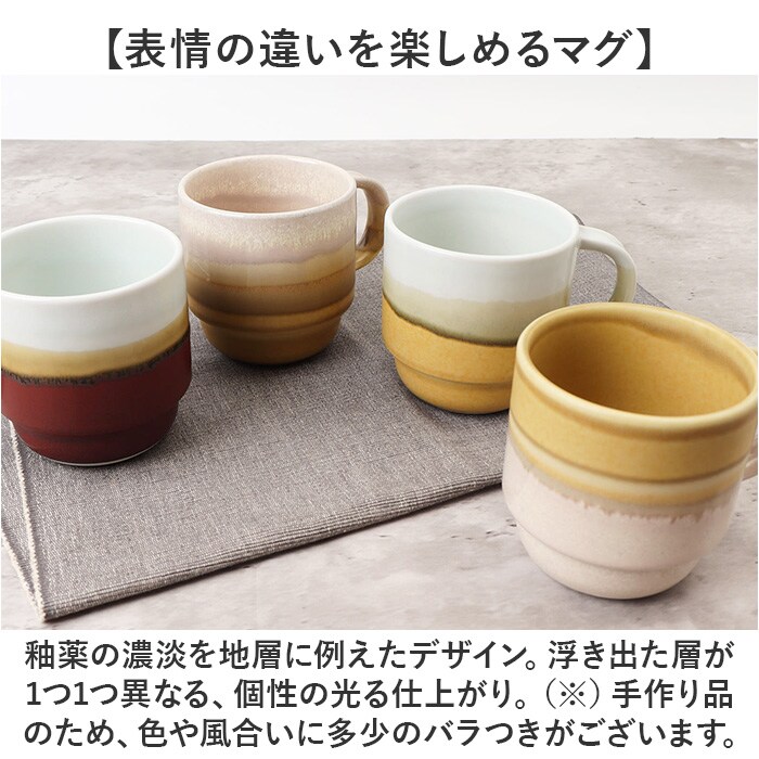 | 商品説明 | 【お気に入りの食器で暮らしを豊かに】自宅でホッと一息つくのティータイムに♪温かみのある「ストレータマグ」。【表情の違いを楽しめるマグ】釉薬の濃淡を地層に例えたデザイン。浮き出た層が1つ1つ異なる、個性の光る仕上がり。(※)手作り品のため、色や風合いに多少のバラつきがございます。【伝統ある波佐見焼きアイテム】長崎県波佐見町で生産されている陶磁器。鮮やかな色合いや、モダンなデザインが魅力◎【デイリーに使いやすいサイズ感】コーヒーや紅茶を楽しむのにちょうどいい、容量300ml。指を通しやすい持ち手付き。【電子レンジでの温めOK】電子レンジを使えて、ドリンクの温め直しなども可能。使い勝手の良さも魅力の1つ。【食洗機に任せて、ひとやすみ】家庭用食洗機に対応。洗い物時間を減らせて、忙しい毎日の味方!【スタッキングできて省スペース】複数揃えても、重ねて収納。食器棚の中でも場所を取らず、空間を有効活用。【お気に入りを選べるカラー】使う人を選ばない、落ち着きのあるカラー。家族分や来客用に色違い揃え♪【贈り物にもおすすめのアイテム】安心の日本製&ボックス入り。お祝いなどのギフトにもぴったり。 |