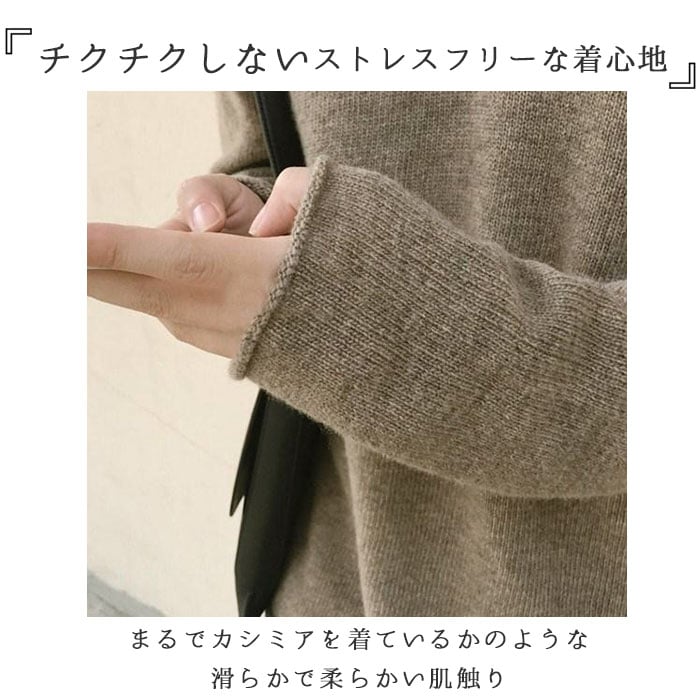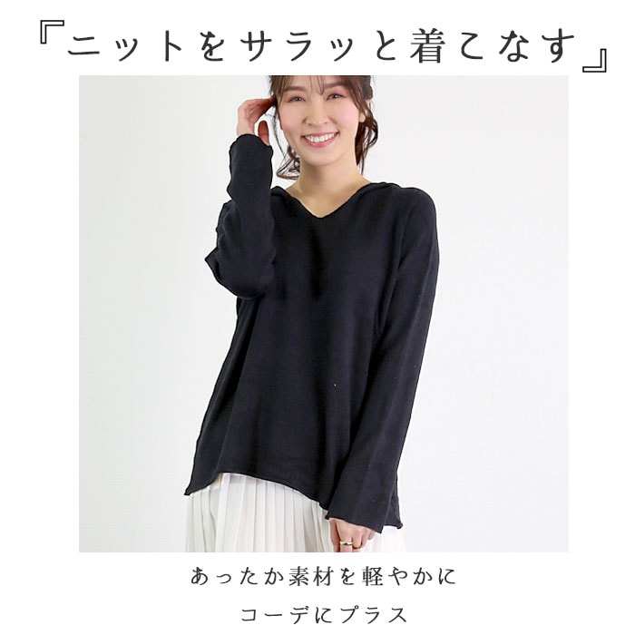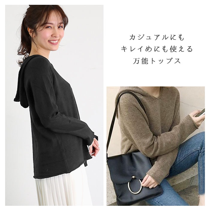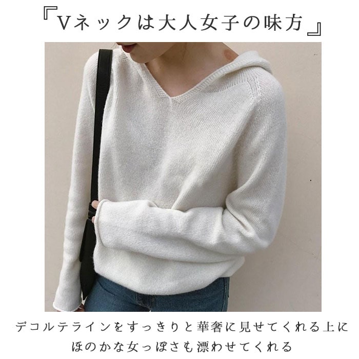 | 商品説明 | まるでカシミアを着ているかのような滑らかで柔らかい肌触り。カシミアタッチVネックニットの登場。チクチクしないストレスフリーな着心地は、1度着たら虜になりそうなくらい気持ちがいい。開きすぎない首元のVネックがデコルテと顔周りをすっきりに見せてくれるのが嬉しい。腰にかかるくらいのちょうどいい丈感はスカート、パンツどちらにも合わせやすく着回し力抜群。カジュアルすぎないフードがちょっとしたワンポイントに♪ベーシックなデザインで幅広いアイテムと相性良くコーディネートできる。 |