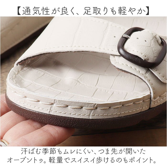 | 商品説明 | 【軽くて歩きやすい!万能サンダル】履き心地抜群◎色んな場面で使える「fee des fleurs コンフォートサンダル」。【柔らかく、足に優しくフィット】弾力性の高い高反発クッション材入りインソール。足裏をふんわり優しく受け止め、疲れを軽減。【インソールは抗菌仕様で衛生的】高い抗菌作用を発揮する、銀イオンAg+の抗菌剤を練込加工。いつも清潔をキープ。【脱ぎ履きしやすく自分サイズに調節】甲ベルトはゴム機能付きで締め付けず、サッと足入れOK。5段階穴で調節もラクラク。【通気性が良く、足取りも軽やか】汗ばむ季節もムレにくい、つま先が開いたオープントゥ。軽量でスイスイ歩けるのもポイント。【安定感のある歩行をサポート】負担が少ない軽量EVAコンプレッションソール。接地面の一部にはグリップ力に優れたゴムを。【室内でも屋外でも大活躍のアイテム】デイリー使いにはもちろん!オフィス用や自宅のベランダ用サンダルとしても重宝。【キレイめにもカジュアルにもマッチ】肌馴染みの良い、落ち着きのあるカラーをラインナップ。どんなコーデにも合わせやすい♪ |
