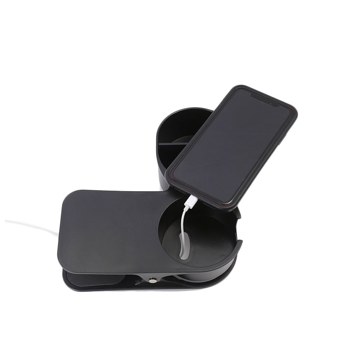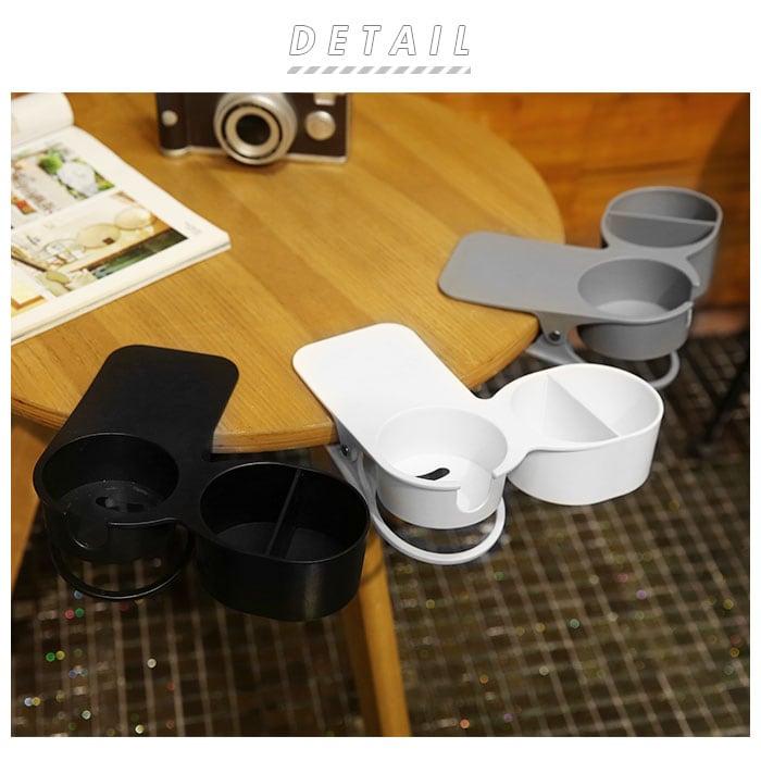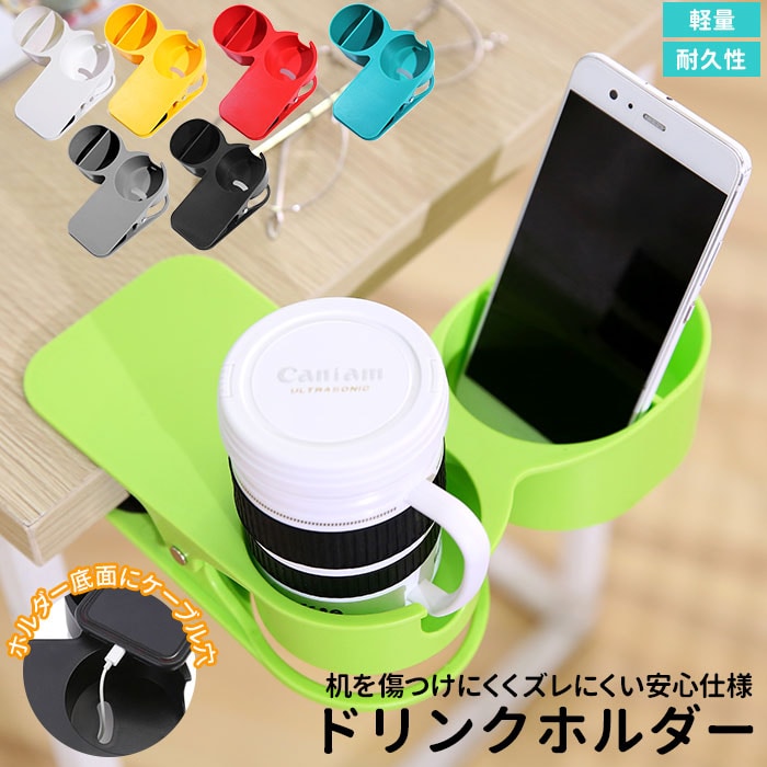 | 商品説明 | カフェタイムに!デスクワークに!使いやすさ満点のドリンクホルダーが新登場♪机のスペースはそのままに、収納スペースを拡張!簡単に装着できるクリップタイプのドリンクホルダー。机の上で倒してしまうと厄介なドリンク類。高さのあるホルダーに入れれば安定感もあって安心。ホルダー側面に切り欠きを設けているので、持ち手がついたカップもきちんと収まる。ドリンクカップだけでなく、スマホを入れておけば急な電話にもサッと対応可能。ホルダー底面にケーブル穴があるので、充電の所定スペースとしてもぴったり。収納スペースは、細々としたアイテムもすっきり仕分け収納できる仕切り付き。机の天板に挟んで使うクリップは内側をウレタン素材でコートしてあるので、机を傷つけにくくズレにくい安心仕様。水をはじく合成樹脂でお手入れ簡単!軽量で耐久性もあるので、キャンプなどのアウトドアでの使用にもおススメ! |