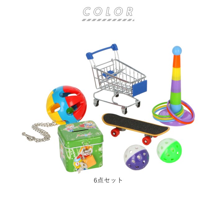 | 商品説明 | 小鳥さんと楽しく遊べるバラエティおもちゃ♪大人気ペットグッズに、バードトイ・6点セットが仲間入り!おしゃべりが得意で知能が高いことで知られるオウムやインコ。そんな小鳥さんと遊びながら、コミュニケーションが深められる知育玩具の豪華6点セット。1.ショッピングカート・・・小物を拾い上げながら、ショッピング気分が楽しめる♪ミニミニサイズのショッピングカート。2.スケートボード・・・キッズに大人気のスケートボードが小鳥さんサイズに。裏面フォトプリントが施された本格ミニチュア仕様。3.輪投げセット・・・コーンの高さが5段階に調整できて、楽しく輪投げ遊び。4.貯金箱・・・散らばったコインを拾っては投げ込む、貯金箱遊びが一緒にできちゃう!鍵付き南京錠を開ければ、コインがいくら貯まったか楽しみに♪5.チェーン付き鈴入りボール・・・止まり木のそばや、鳥かごの中につるしておけば、飼い主さんがお留守の間だってご機嫌ひとり遊び。6.鈴入りボール×2個・・・シャラシャラと涼やかな音色が心地よいボールがセットに。ショッピングカートと組み合わせて、玉入れ遊びもできちゃう!お留守がちな飼い主さんとのコミュニケーション不足解消や、運動不足解消にもぴったり!動画や写真をフォトジェニックに彩る豪華6点セット。ペット系ユーチューバーさんにもオススメ。 |